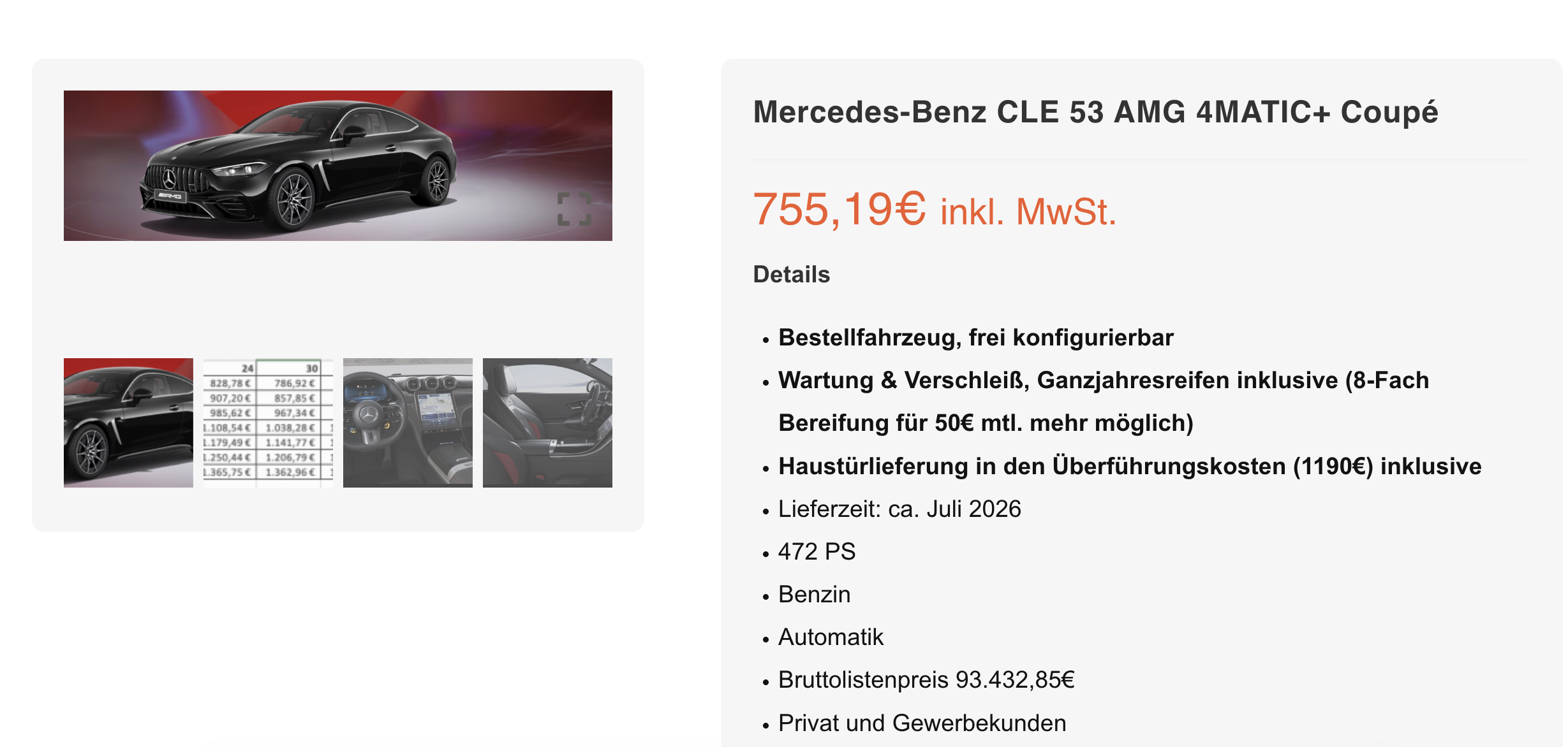 Sportliches Design, Allrad-Souveränität und ein umfassendes Servicepaket inklusive. Bei Leasing-Fux gibt es aktuelle ein Mercedes-Benz CLE 53 AMG 4MATIC+ Coupé zum attraktiven Preis von 755,19 Euro brutto pro Monat. Auch Gewerbekunden profitieren von einem exklusiven Deal, das Fahrzeug ist bei anderen Leasinggebern selten bis gar nicht verfügbar.
