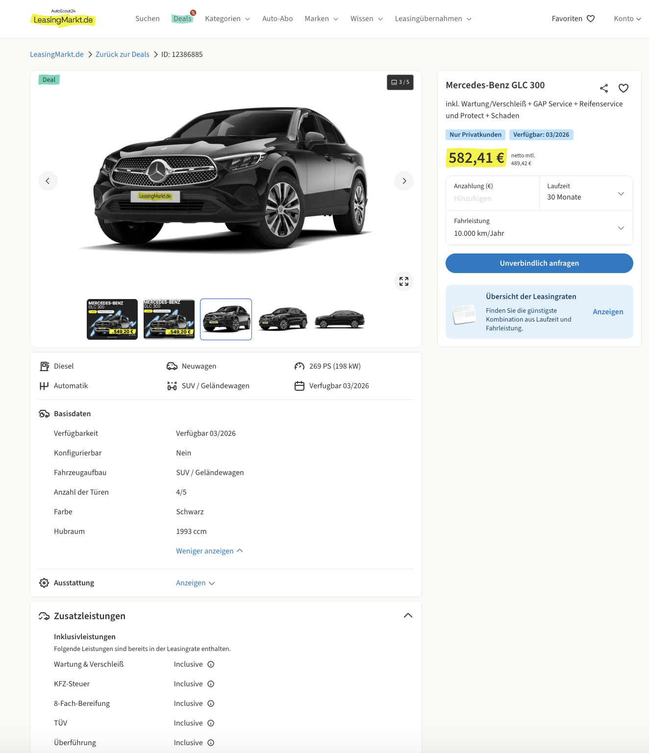 Diesel Coupé mit Komfortpaket und vielen Extras. Bei LeasingMarkt bekommt ihr den Mercedes-Benz GLC 300 d 4MATIC Coupé AMG Line Advanced im Privatleasing für 582,41 Euro brutto im Monat im Full-Service-Paket. In der Rate sind Wartung, Verschleiß, 8-fach-Bereifung, Kfz-Steuer, TÜV, Überführung und Zulassung bereits drin, ihr habt also einen großen Teil der Fixkosten direkt abgedeckt. Die Lieferzeit liegt bei etwa 18 bis 20 Wochen, konfiguriert wird normal über den Händler. Zur Wahl stehen unter anderem Obsidian Schwarz, Graphit Grau, Spektral Blau, Verde Silber und Hightech Silber.