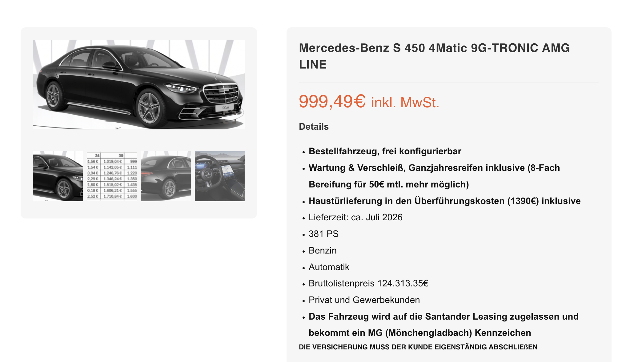 Die S-Klasse steht seit Generationen für das Businessmodell von Mercedes-Benz. Bei Leasing-Fux gibt es den Mercedes-Benz S 450 4MATIC 9G-TRONIC AMG Line als Full-Service-Leasing für 999,49 Euro brutto im Monat. Angeboten wird die Oberklasselimousine als frei konfigurierbares Bestellfahrzeug, die geplante Lieferzeit liegt bei etwa Juli 2026. Preis und Anbieter sind damit von Beginn an klar definiert und ermöglichen eine saubere Einordnung im Markt.