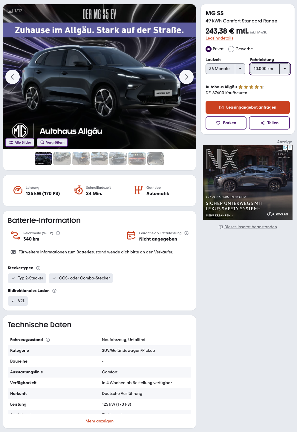 Ein kompakter Stromer, mit Tageszulassung, der trotzdem nach Neuwagen riecht. Angeboten wird der MG S5 EV Comfort Standard Range bei mobile.de für 243,38 Euro brutto im Monat, mit Tageszulassung, erhältlich für Privat und Geschäftskunden. Das Fahrzeug ist schneller Verfügbarkeit, mit einer Lieferzeit von 4 Wochen ab Bestellung. Auf Wunsch ist sogar eine Hauslieferung ab 99 Euro möglich. Wer optisch noch einen draufsetzen will, bekommt eine Sonderfarbe für 650 Euro Aufpreis, zur Wahl stehen Medal Silver, Dover White, Piccadilly Blue, Andes Grey, Pebble Black und Diamond Red.