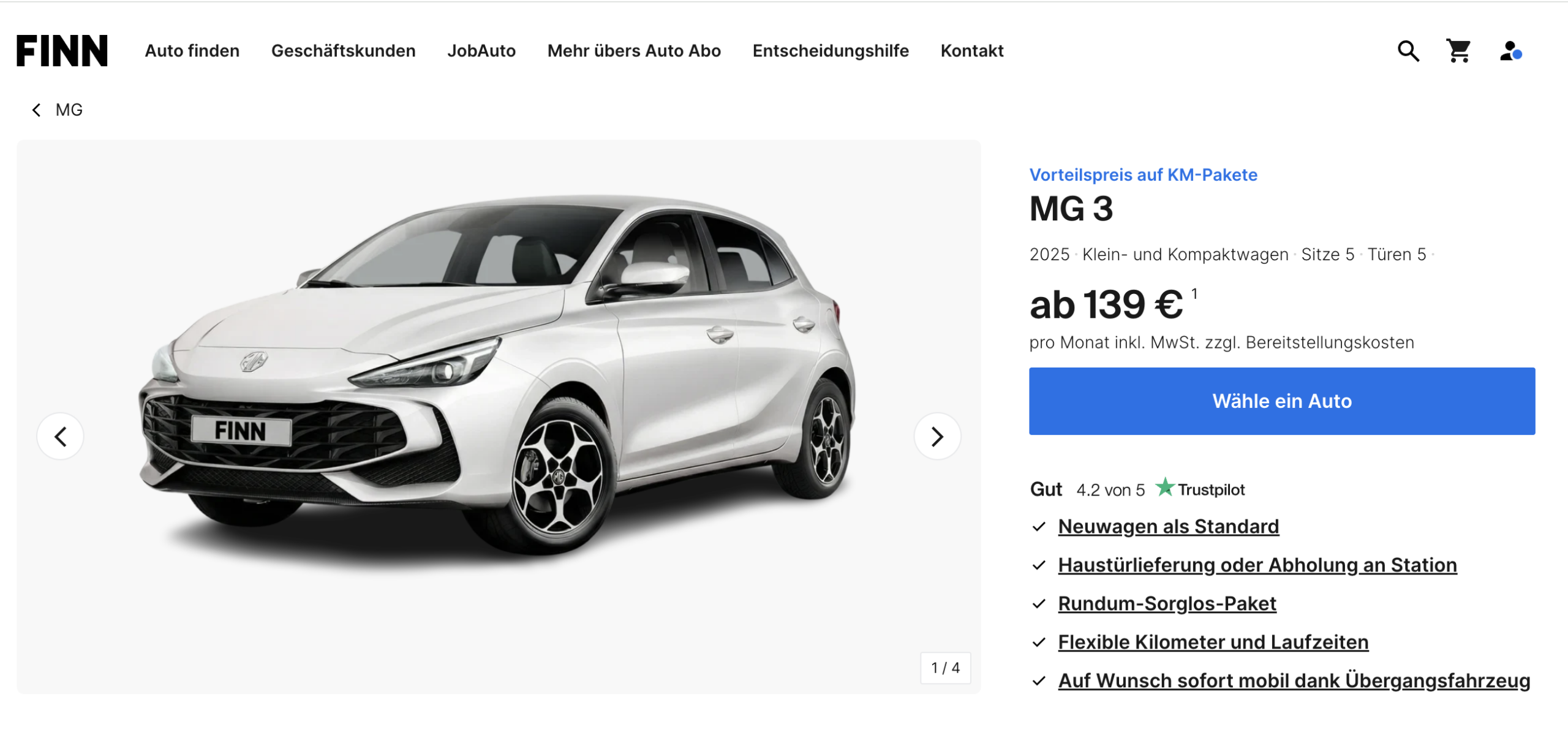 MG im günstigen Auto-Abo! Der MG MG3 1.5l 85 kW ist bei FINN für 139 Euro brutto im Monat erhältlich. Dieses All-inclusive-Angebot richtet sich an alle, die Mobilität ohne langfristige Bindung suchen. Im Gegensatz zu Finanzierung oder klassischem Leasing sind Zulassung, TÜV, Inspektionen, Verschleiß, Reifenwechsel bereits in der monatlichen Rate enthalten. Die Lieferung erfolgt auf Wunsch bis zur Haustür oder an eine Abholstation. Bereitstellungskosten von 1.500 Euro können entweder einmalig gezahlt oder monatlich für 133 Euro abbezahlt werden. Den Unterschied zwischen Leasing, Vario-Leasing und Auto-Abo haben wir in unserem Ratgeber erklärt.