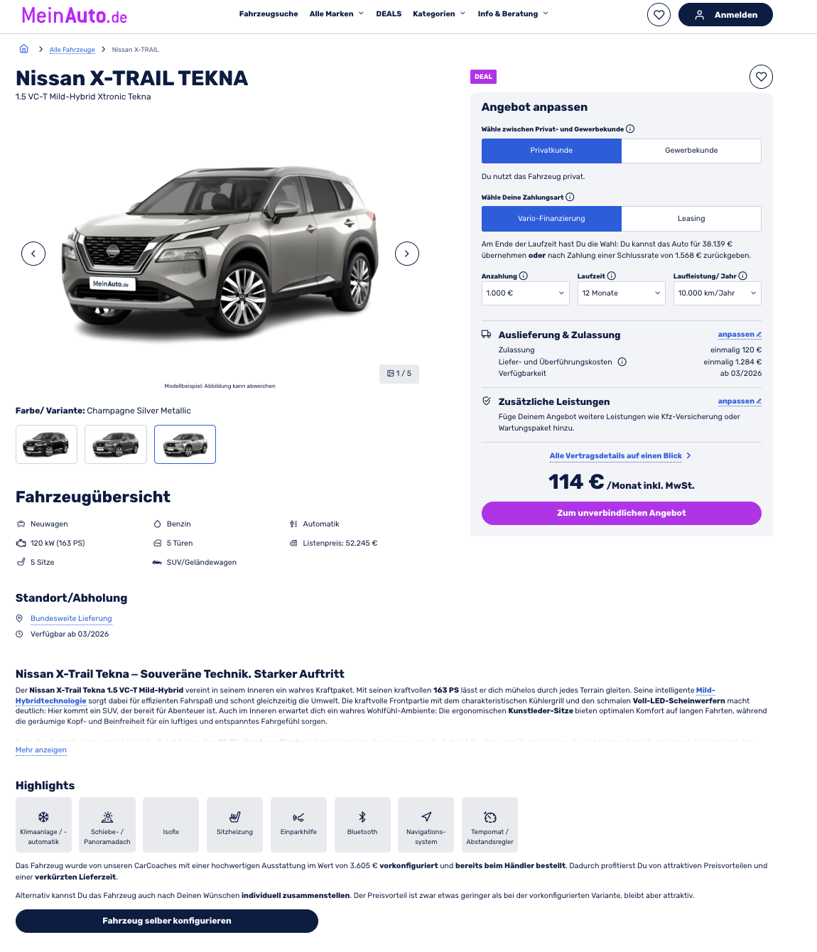 Zum Jahresabschluss gibt es nochmal ein richtiges GRANATEN-Angebot 🚀 für euch! Aktuell gibt es den Nissan X-TRAIL 1.5 VC-T Mild-Hybrid Xtronic Tekna bei MeinAuto im Vario-Leaisng für günstige 114 Euro brutto pro Monat, bei einer Anzahlung von 1.000 Euro. Kalkuliert wurde das Angebot mit einer Laufzeit von 12 Monaten und 10.000 Freikilometer. Am Ende der Laufzeit habt ihr die Wahl: Ihr könnt das Auto für 38.139 Euro übernehmen oder nach Zahlung einer Schlussrate von 1.568 Euro zurückgeben. Das Fahrzeug ist vorkonfiguriert und in den Metallic-Farben Champagne Silver, Dark Grey und Diamant Black ab März erhältlich.