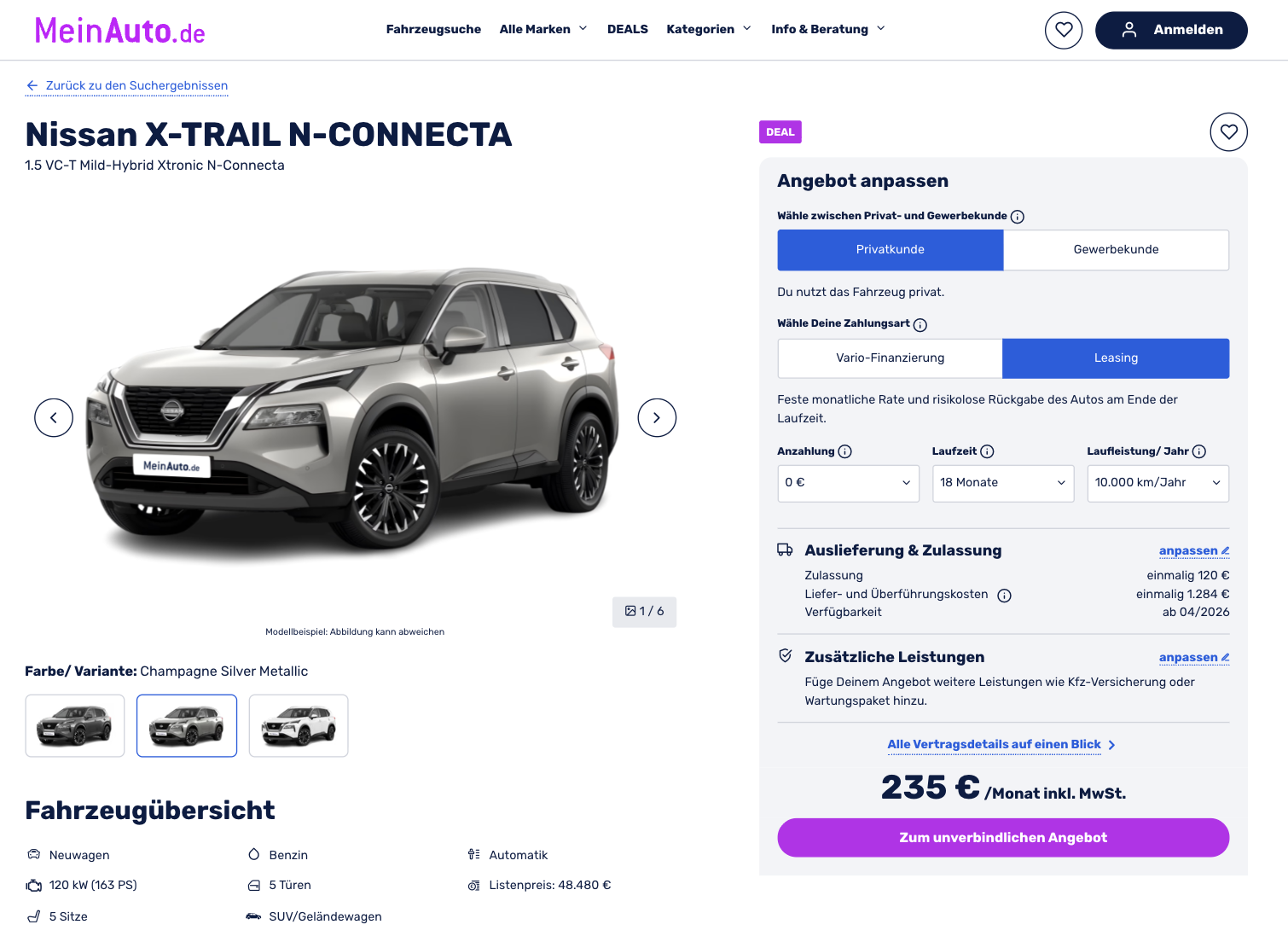 Familien-SUV mit sieben Sitzen zum attraktiven Leasingpreis. Der Nissan X-TRAIL richtet sich an Fahrer, die ein geräumiges SUV mit viel Alltagstauglichkeit suchen. Angeboten wird der Nissan X-TRAIL 1.5 VC-T Mild-Hybrid Xtronic N-Connecta bei MeinAuto für 235 Euro brutto pro Monat. Das Fahrzeug ist bereits bestellt und soll ab April verfügbar sein. Zur Auswahl stehen die Farben Dark Grey Metallic, Champagne Silver Metallic und Pearl White Perleffekt.