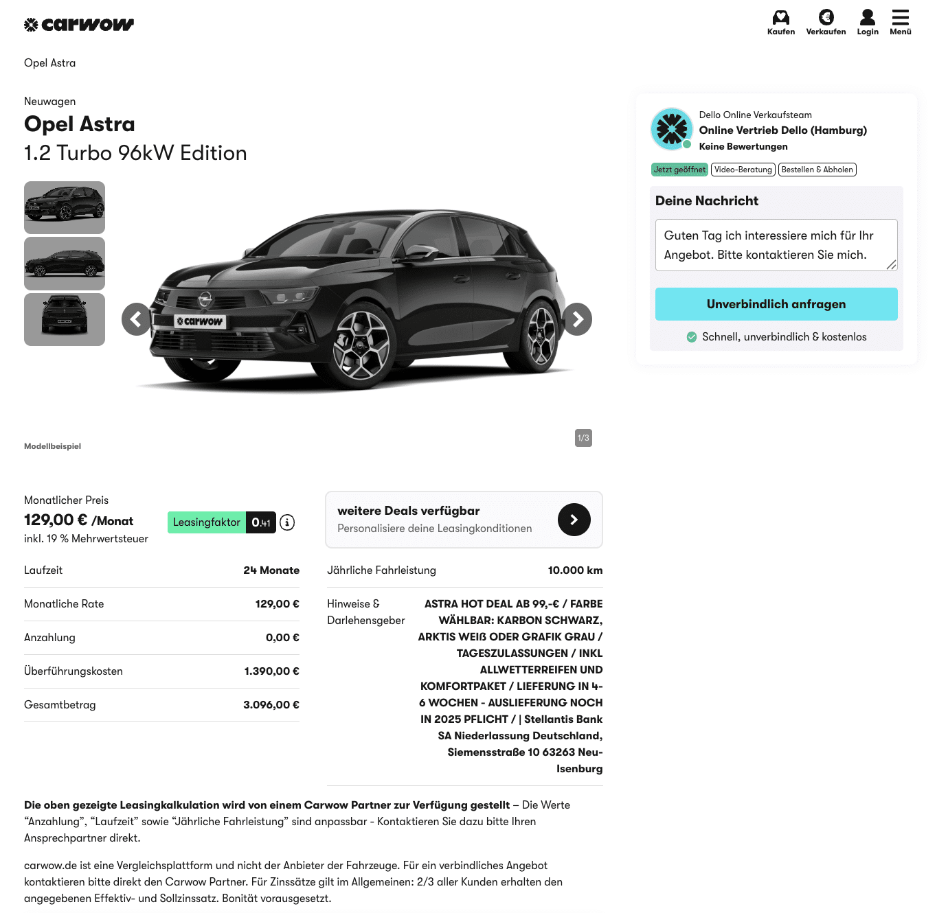 Seit Jahrzehnten prägt er die Straßen und hat sich längst als feste Größe im Kompaktsegment etabliert: der Opel Astra. Jetzt gibt es den Astra 1.2 Turbo 96 kW Edition bei carwow im Privatleasing für nur 129 Euro brutto im Monat, ein Preis, der in dieser Klasse kaum zu schlagen ist. Es handelt sich um Fahrzeuge mit Tageszulassung, die bereits bestellt sind und innerhalb von vier bis sechs Wochen verfügbar sein werden. Zur Wahl stehen die Farben Karbon Schwarz, Arktis Weiß oder Grafik Grau.
