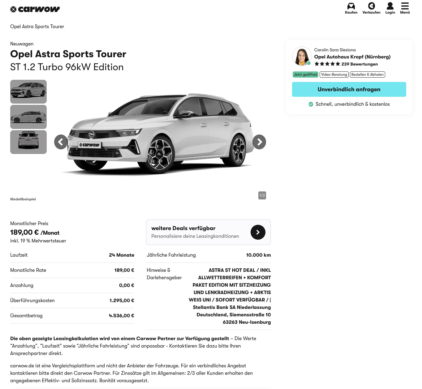 Das Angebot bei carwow ist auf 24 Monate Laufzeit und 10.000 Kilometer pro Jahr zugeschnitten, Anpassungen sind in der Regel möglich. Ein Blick zum Umfeld zeigt den Vorteil deutlich, beim Platzhirsch ist ein vergleichbarer Opel Astra ST aktuell nur auf Anfrage gelistet, klare Konditionen fehlen dort.