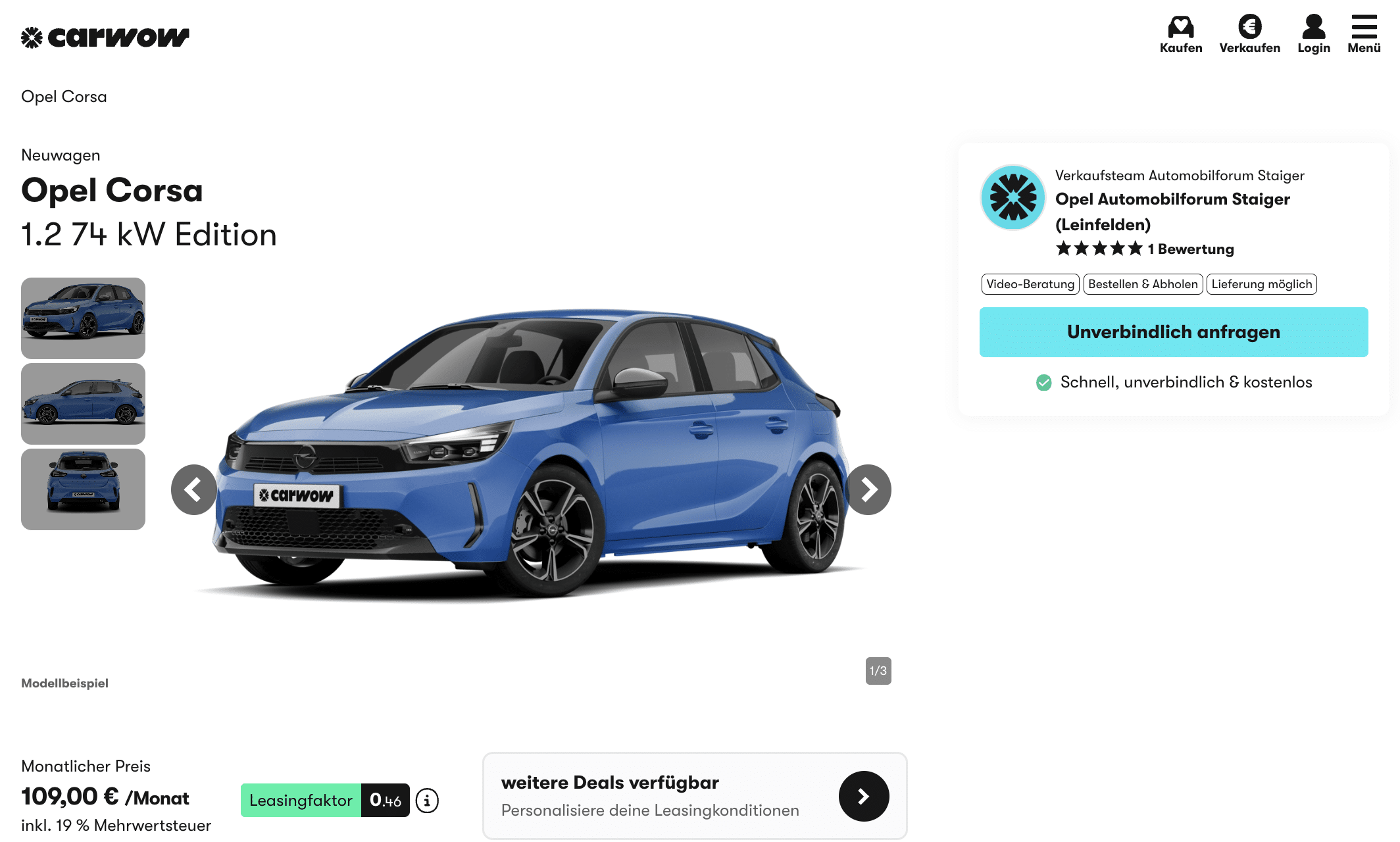 Wer einen kompakten Alltagsbegleiter sucht, wird bei carwow fündig: Der Opel Corsa 1.2 Turbo Edition steht dort als sofort verfügbarer Lagerwagen für nur 109 Euro brutto im Monat im Privatleasing bereit. Mit einer Laufzeit von 24 Monaten und 5.000 Kilometern jährlich ist das Angebot besonders interessant für alle, die Wert auf Flexibilität legen – beide Parameter lassen sich zudem anpassen.