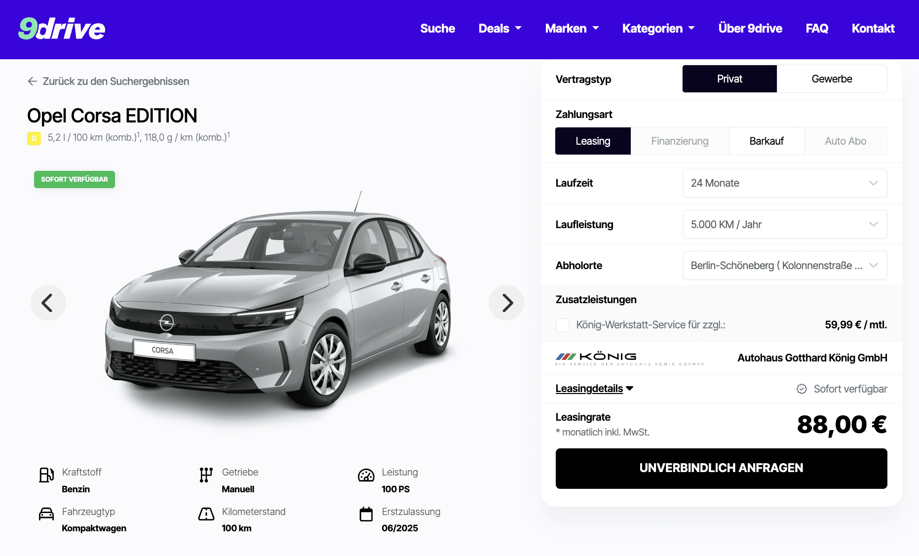 Das Angebot von 9drive ist auf 24 Monate Laufzeit und 5.000 Freikilometer pro Jahr kalkuliert.