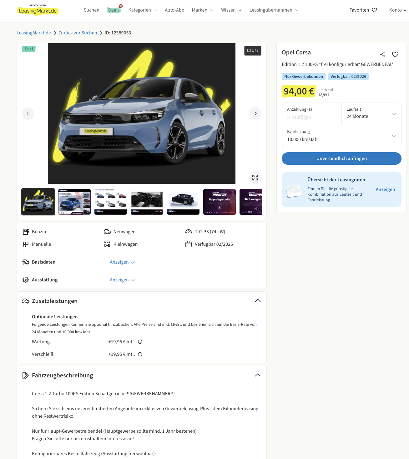 Das Angebot ist auf 24 Monate und 10.000 Kilometer pro Jahr ausgelegt. Beides lässt sich anpassen. Der Blick zum Platzhirsch schärft den Eindruck zusätzlich. Dort werden für einen vergleichbaren Opel Corsa 117 Euro netto pro Monat aufgerufen.
