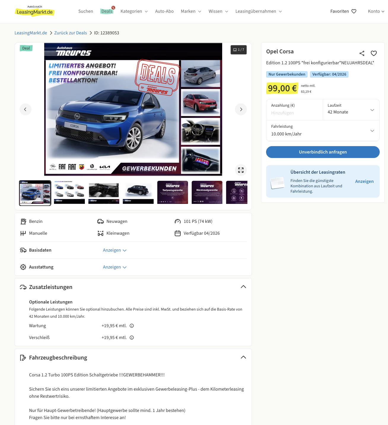 Das Angebot ist auf 42 Monate Laufzeit und 10.000 Kilometer pro Jahr ausgelegt, beides lässt sich in der Regel anpassen. Der Platzhirsch ruft für einen vergleichbaren Opel Corsa aktuell 97 Euro netto pro Monat auf.