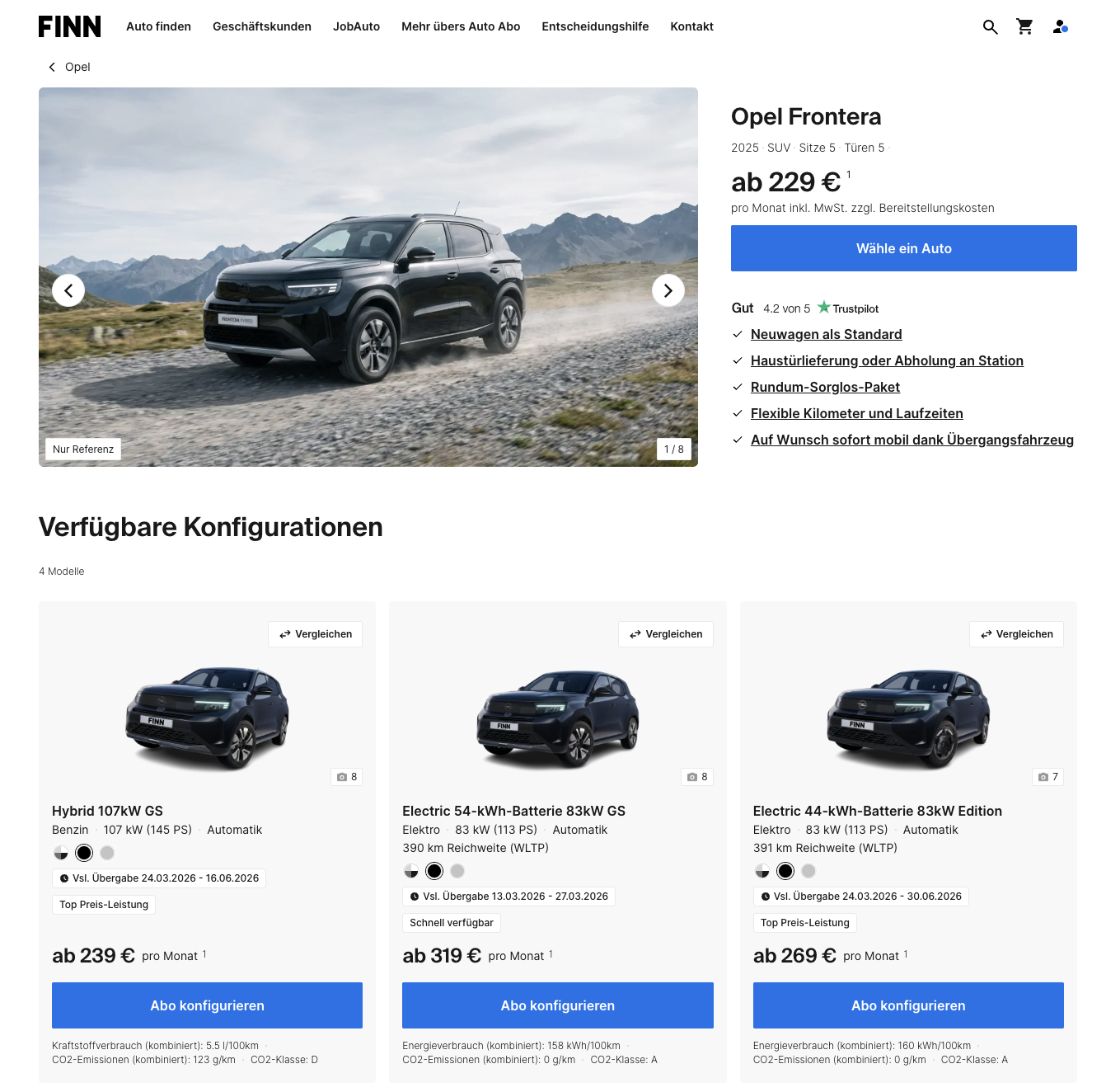 Wer komplett elektrisch fahren möchte, kann innerhalb des Angebots auch zur elektrischen Variante des Opel Frontera greifen. Die Version mit 44-kWh-Batterie startet bei 269 Euro brutto pro Monat, während die Variante mit 54-kWh-Akku für 319 Euro monatlich erhältlich ist. Damit lässt sich das Fahrzeugkonzept flexibel an die eigenen Bedürfnisse anpassen, egal ob mit Hybridantrieb oder rein elektrisch.