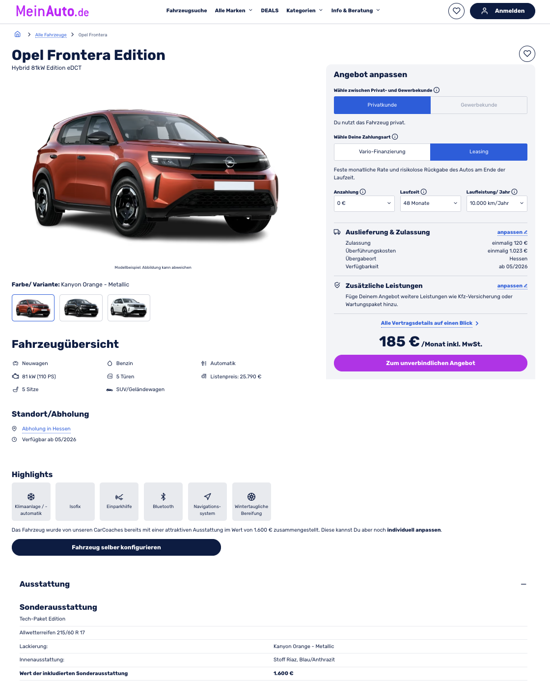 Sparsames Kompakt-SUV mit überschaubarer Rate. Bei MeinAuto gibt es den Opel Frontera Hybrid 81 kW eDCT Edition für 185 Euro brutto im Monat, gerechnet mit 48 Monaten Laufzeit und 10.000 Kilometern pro Jahr. Das Fahrzeug ist bereits vorkonfiguriert, ihr könnt ihm aber noch den letzten Feinschliff geben, bevor es im Mai 2026 ausgeliefert wird, zum Beispiel bei Farbe oder einzelnen Extras.