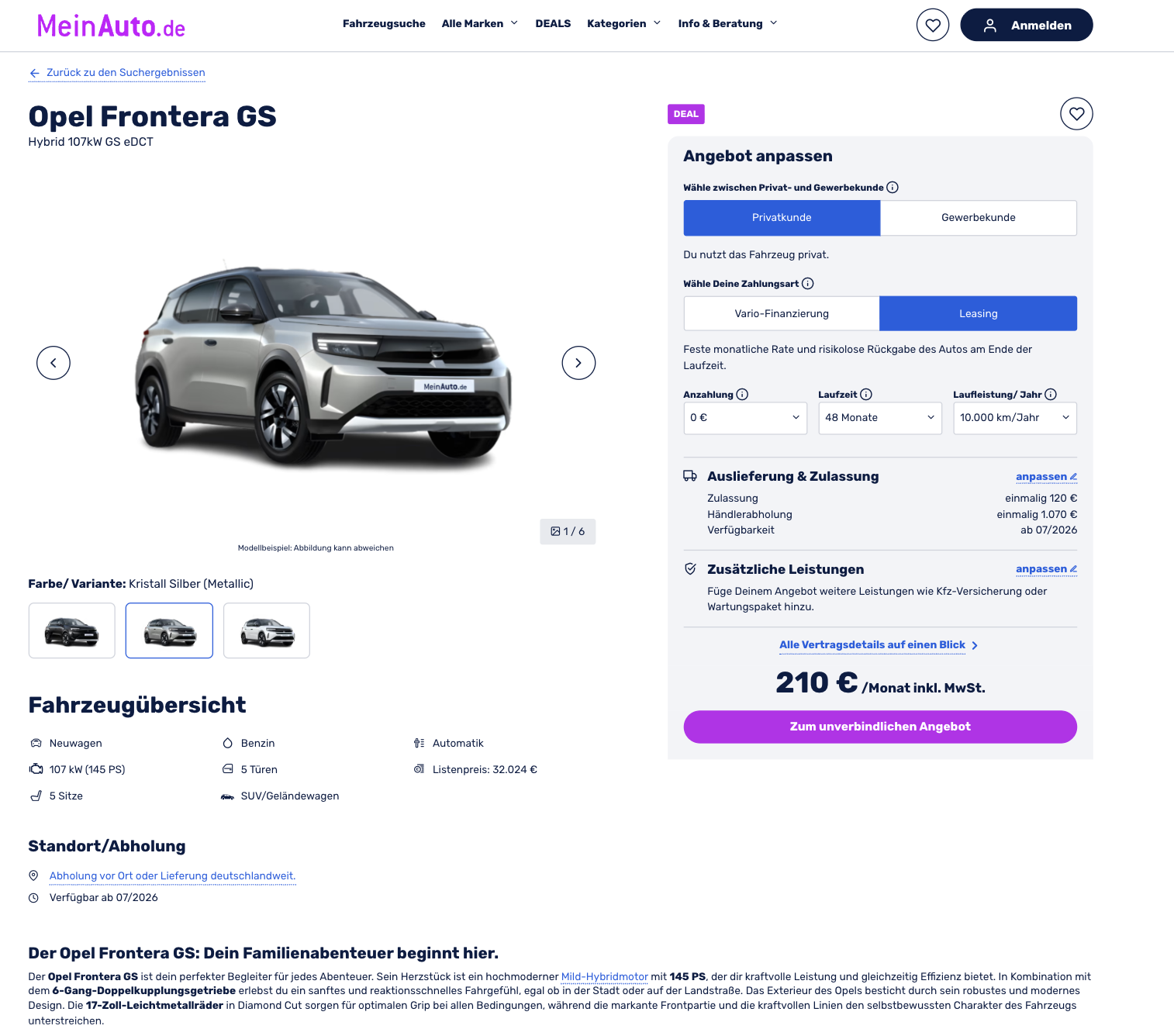 Kalkuliert ist das Angebot mit 48 Monaten Laufzeit und 10.000 Kilometern pro Jahr, Anpassungen sind möglich. Die monatliche Rate von 210 Euro brutto positioniert sich unterhalb vergleichbarer Marktangebote. Der Platzhirsch verlangt für einen ähnlich ausgestatteten Frontera rund 243 Euro brutto pro Monat.