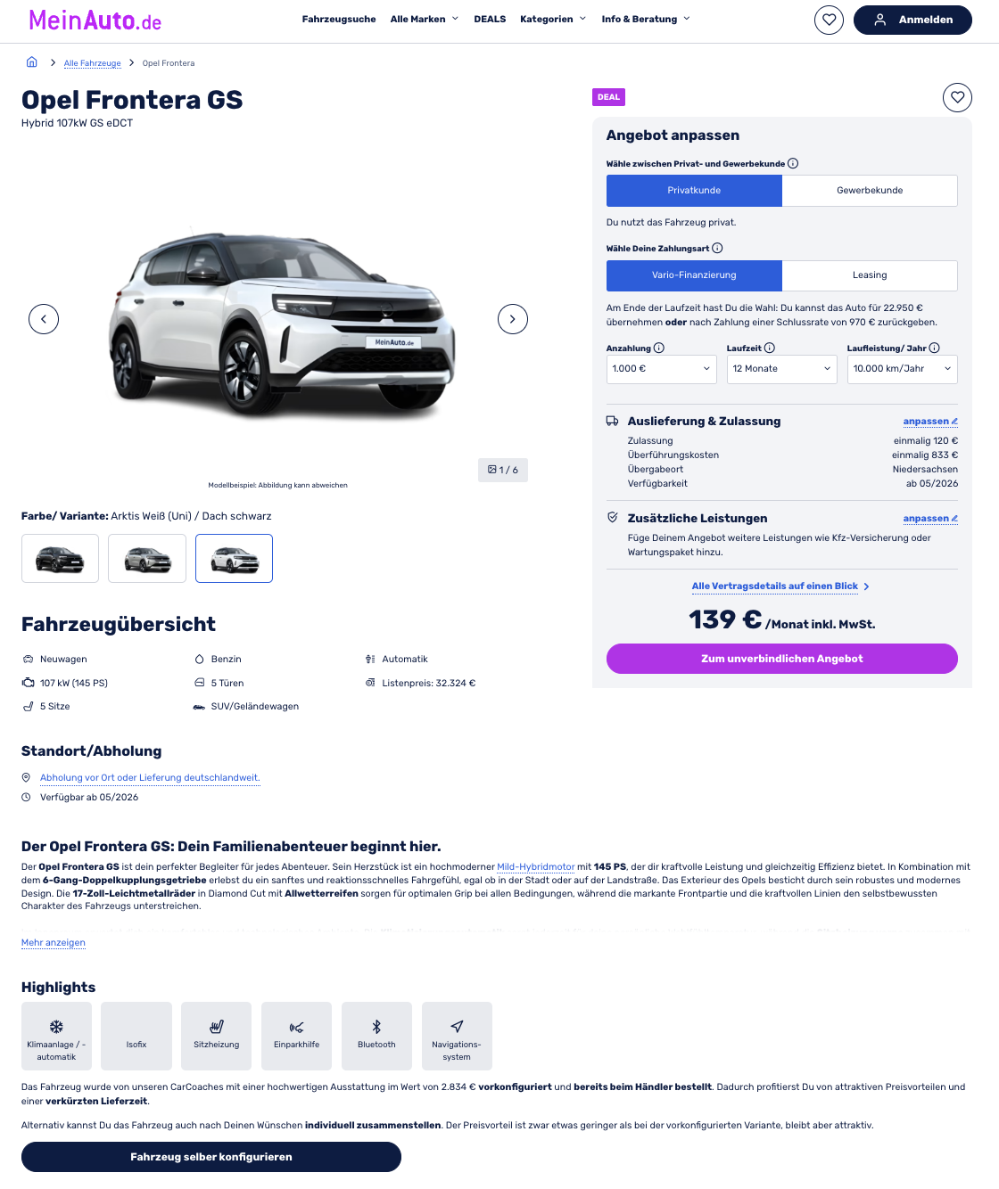 Kalkuliert ist das Angebot mit 12 Monaten Laufzeit und 10.000 Kilometern pro Jahr, Anpassungen sind möglich. Der Vergleich macht den Deal besonders auffällig, denn für ein ähnliches Fahrzeug werden im Marktumfeld 415 Euro brutto im Monat aufgerufen. Hier steht ein Frontera, der viel Ausstattung mitbringt, als Kurzläufer planbar bleibt und dabei finanziell erstaunlich entspannt wirkt.