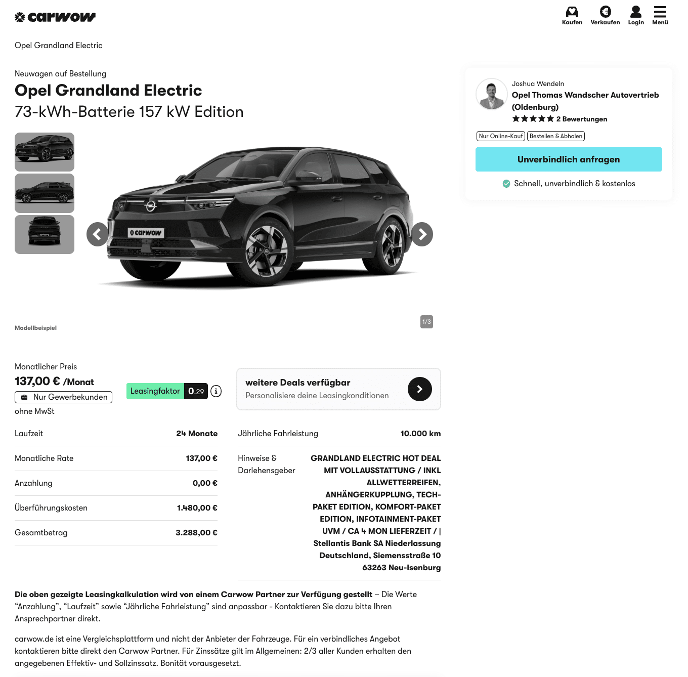 Ein E-SUV mit Platz, Premium-Anmutung und cleverer Effizienz und das zu Konditionen, die herausstechen! Bei carwow fahrt ihr den Opel Grandland Electric in der Edition mit Vollausstattung bereits für 137 € netto/Monat. Der Leasingfaktor von 0,35 unterstreicht, wie attraktiv dieses Paket kalkuliert ist.