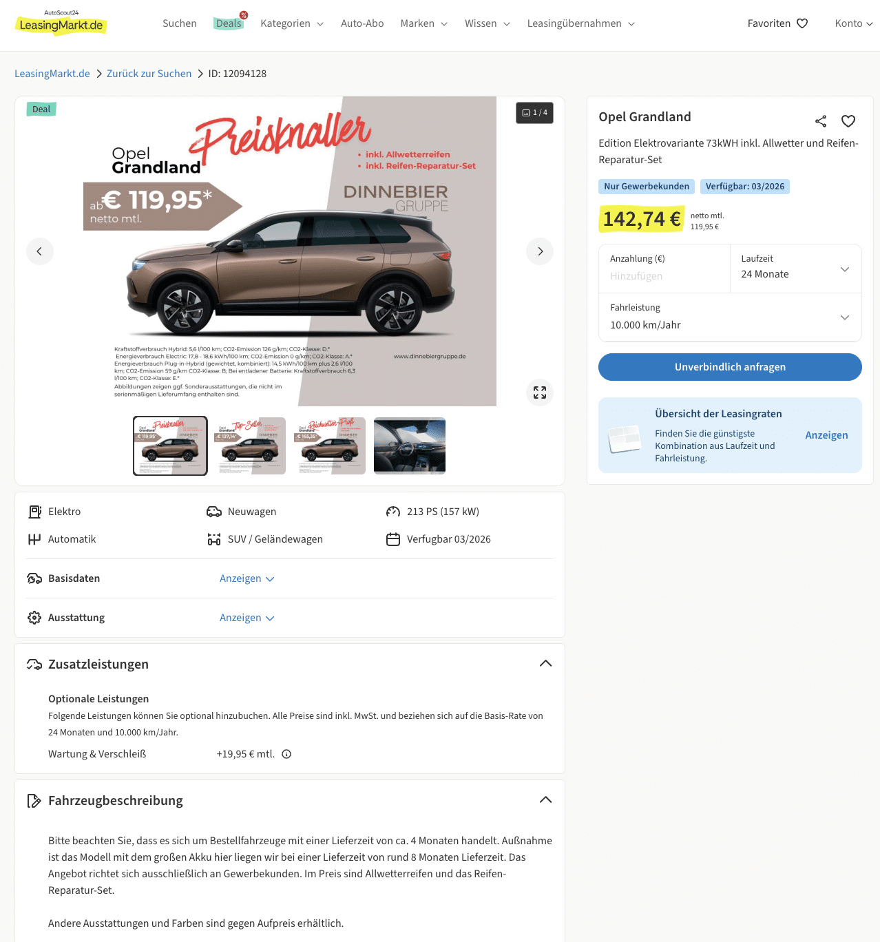 LeasingMarkt setzt die Einstiegsschwelle der E-Mobilität richtig niedrig, 119,95 Euro netto im Monat, Leasingfaktor 0,29, dazu volle Freiheit bei Farbe, Felgen und Assistenten. Der Opel Grandland Electric 73 kWh 157 kW Edition kommt als frei konfigurierbares Bestellfahrzeug, ihr definiert die Details. Die Beispielrechnung steht auf 24 Monate und 10.000 km pro Jahr, Laufzeit und Jahreskilometer lassen sich bei Bedarf anpassen, damit der Deal zu Pendelprofil, Familienalltag oder Projektphase passt.