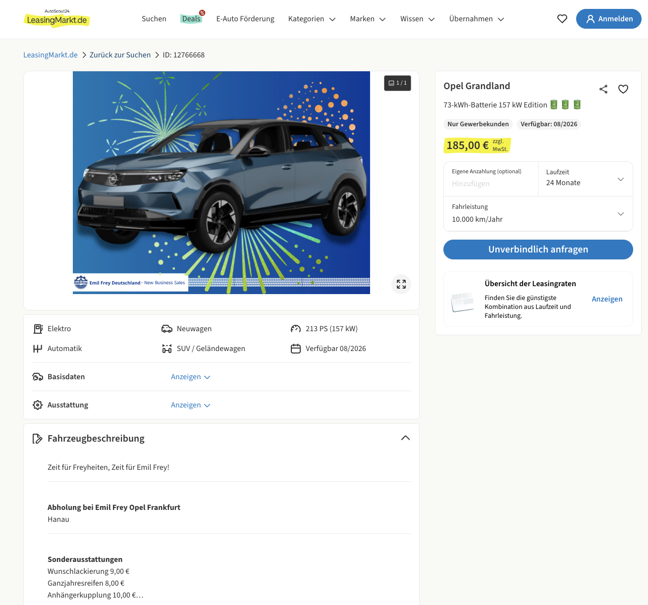 Die Kalkulation basiert auf 24 Monaten Laufzeit und 10.000 Kilometern pro Jahr. Besonders stark wirkt das Angebot im direkten Vergleich. Während ähnliche Modelle aktuell häufig bei rund 620 Euro netto monatlich liegen, bleibt dieser Grandland Electric deutlich darunter.