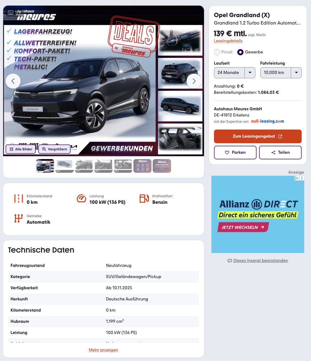 Klarer Auftritt, klassischer Ottomotor und sofort startklar! Den Opel Grandland 1.2 Turbo 100 kW eDCT Edition gibt es aktuell bei mobile.de für 139 Euro netto pro Monat, als Lagerwagen, mit einer kurzen Laufzeit von 24 Monate und 10.000 Freikilometer pro Jahr.