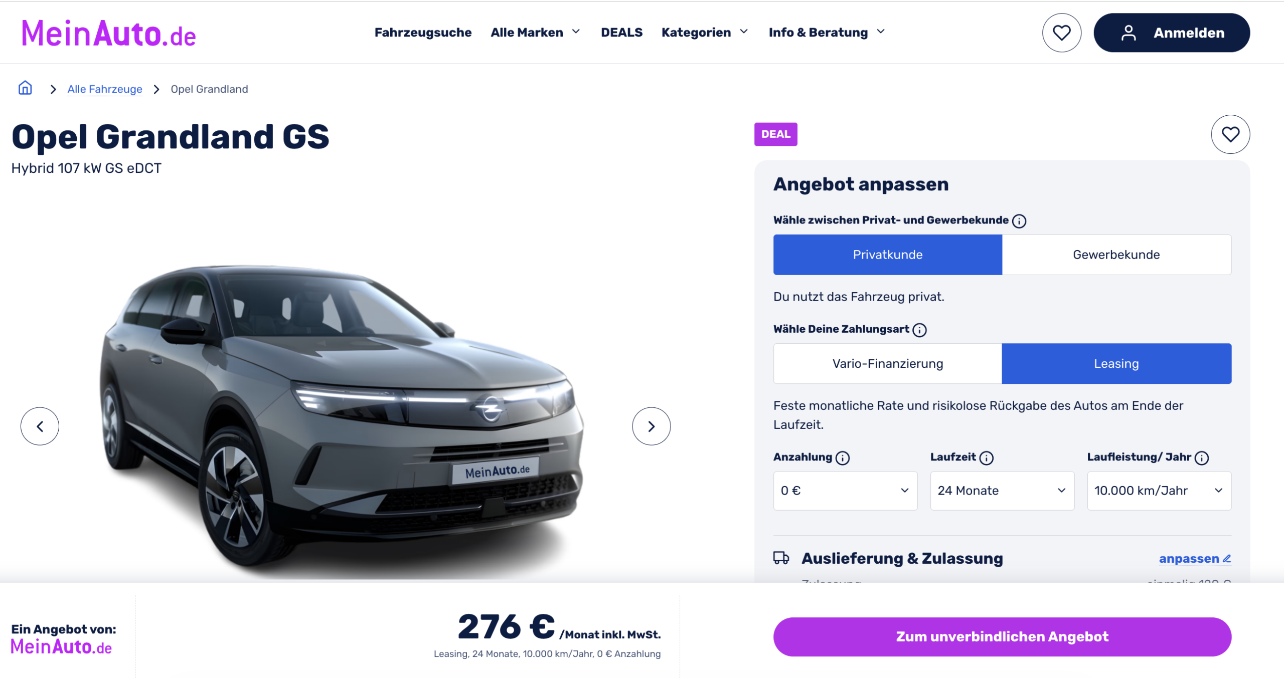 Ein modernes SUV von Opel mit viel Platz zu einer überraschend niedrigen Rate. Angeboten wird der Opel Grandland Hybrid 107 kW eDCT GS bei MeinAuto.de für 276 Euro brutto im Monat. Der vorkonfigurierte Grandland kann bereits im Mai 2026 ausgeliefert werden.