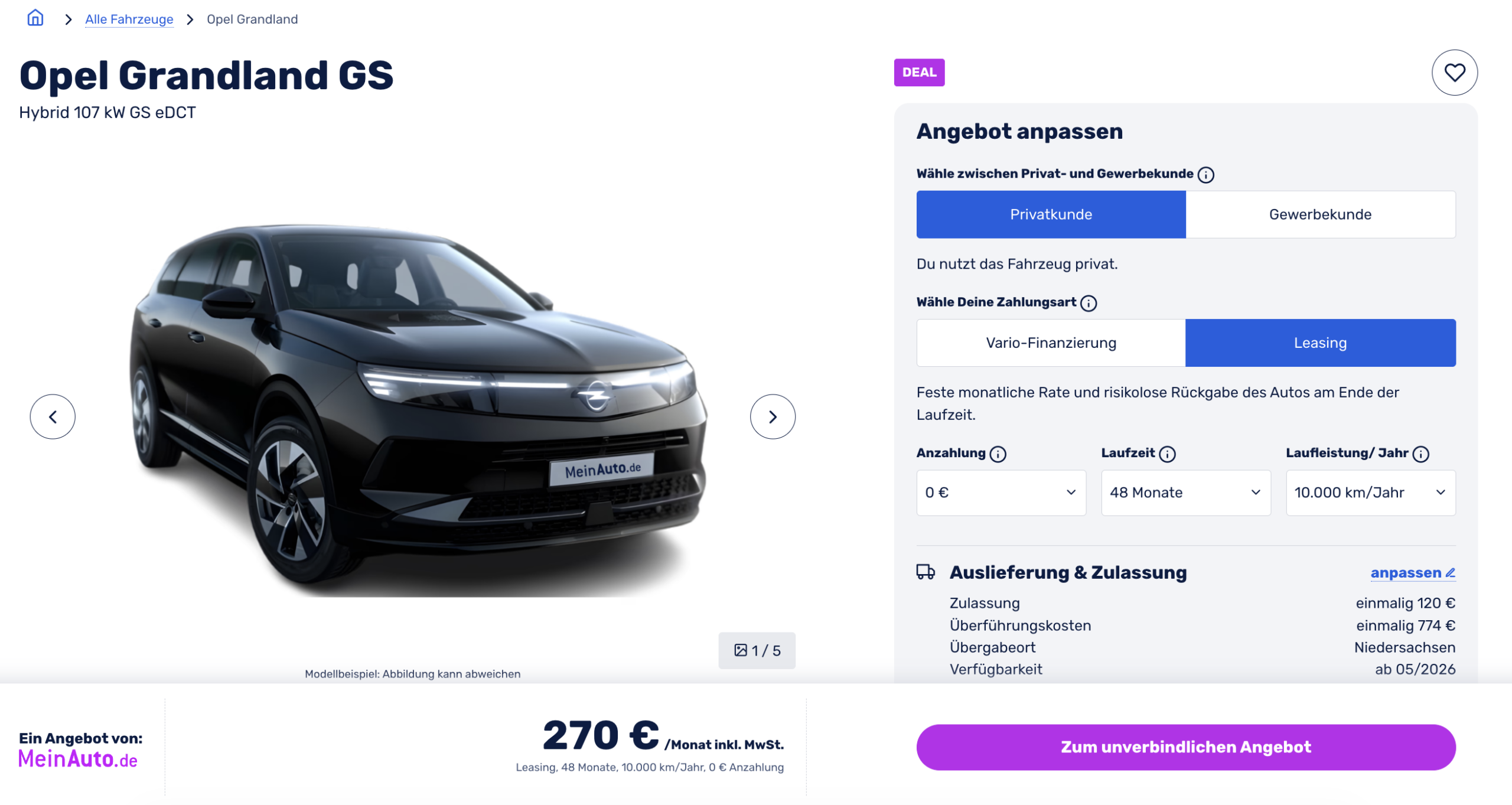 Großer Opel zum kleinen Preis! MeinAuto.de bietet den Opel Grandland Hybrid 107 kW GS eDCT zu einem überraschend günstigen Preis von 270 Euro brutto pro Monat an. Dieses moderne SUV bietet viel Platz und kann bereits im Mai 2026 ausgeliefert werden. Der Grandland ist vorkonfiguriert.