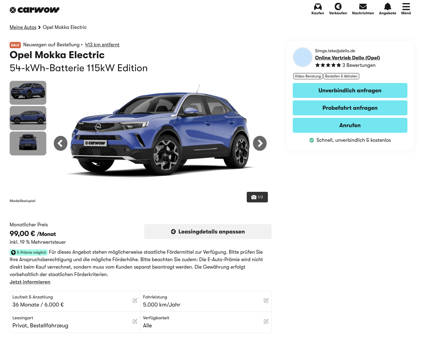 Kompakt, vollelektrisch und deutlich gĂŒnstiger, als es die Fahrzeugklasse zunĂ€chst vermuten lĂ€sst. Den Opel Mokka-e 54 kWh 115 kW Edition können Privatkunden bei carwow fĂŒr 99 Euro brutto pro Monat leasen, kalkuliert mit einer Sonderzahlung von 6.000 Euro, die im Rahmen der neuen UmweltprĂ€mie unter bestimmten Voraussetzungen ganz oder teilweise erstattet werden kann. Wer das Angebot sauber einordnet, sollte deshalb nicht nur auf die erste Zahl schauen. Rechnet man die Sonderzahlung ĂŒber die Laufzeit um, landet der Deal bei einer normalisierten Rate von 266 Euro brutto pro Monat. Genau dadurch wird das Angebot realistisch greifbar und bleibt auch dann interessant, wenn die Förderung nicht vollstĂ€ndig ausgezahlt werden sollte.