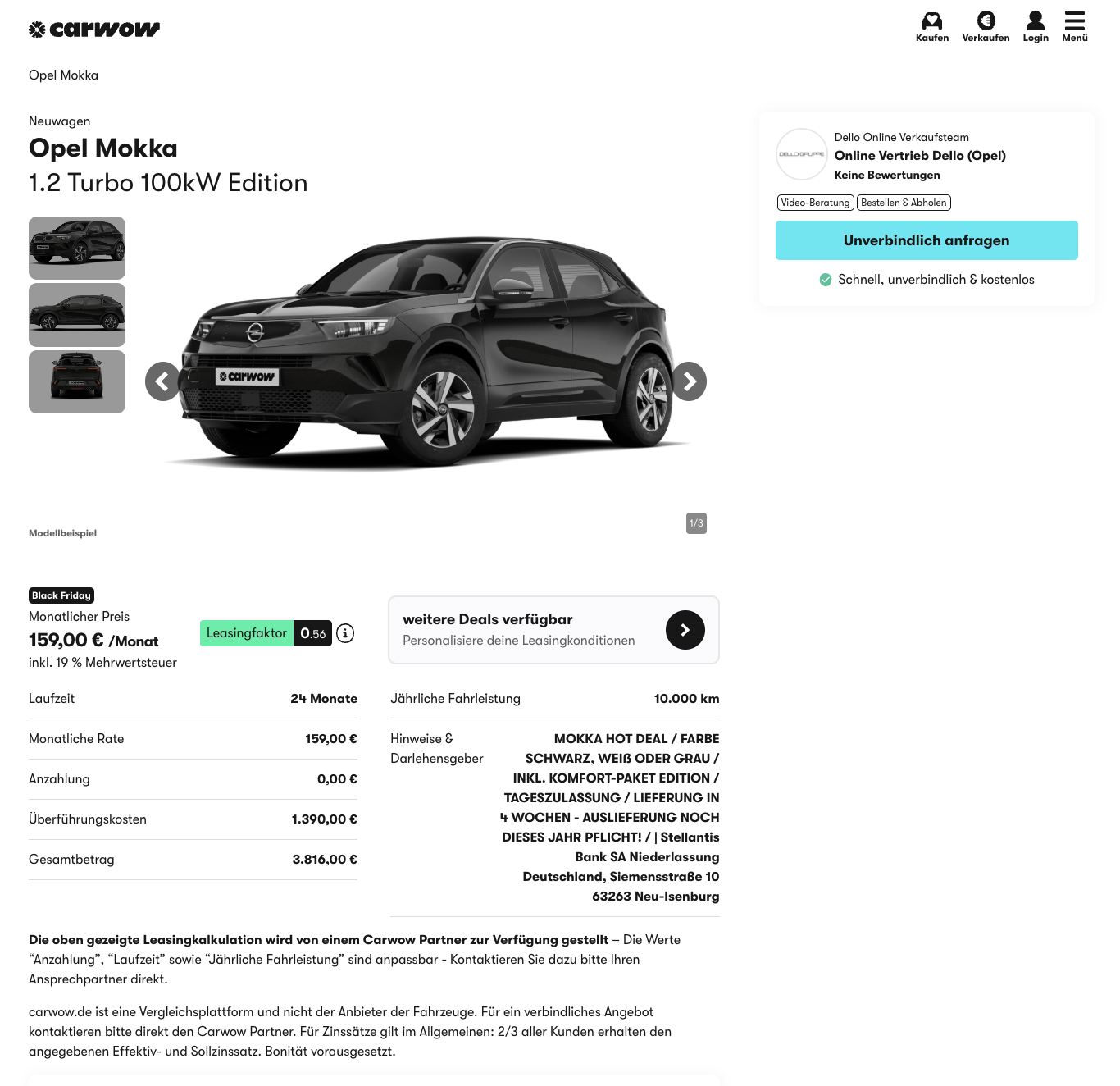 Ausgerechnet zum Tag der Gummistiefel, an dem es heute in fast ganz Deutschland geschneit hat, passt dieser Mokka perfekt ins Bild, nur dass hier nicht die Stiefel im Mittelpunkt stehen, sondern euer nächstes Leasingfahrzeug. Den Opel Mokka 1.2 Turbo 100 kW Edition gibt es aktuell bei carwow für 159 Euro brutto im Monat als Tageszulassung. In Schwarz, Weiß oder Grau ist der Mokka erhältlich und die Lieferzeit liegt bei nur vier Wochen. Der Mokka muss noch dieses Jahr zugelassen werden.