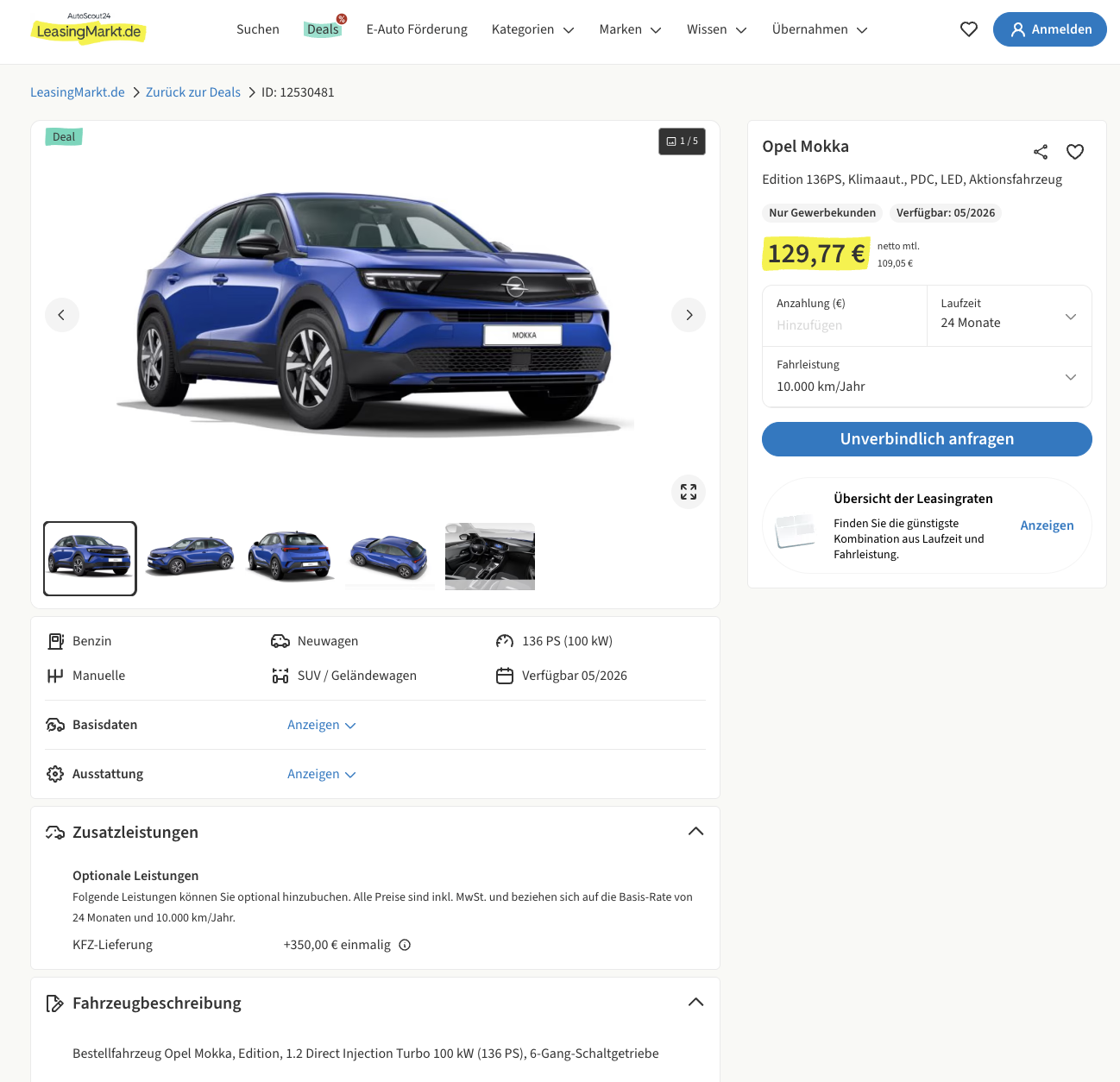 Kalkuliert ist das Angebot mit 24 Monaten Laufzeit und 10.000 Kilometern pro Jahr, Anpassungen sind möglich. Mit 109,05 Euro netto pro Monat liegt der Deal deutlich unter vergleichbaren Angeboten, denn im Marktumfeld werden für ähnlich ausgestattete Modelle teils rund 181 Euro netto pro Monat aufgerufen.