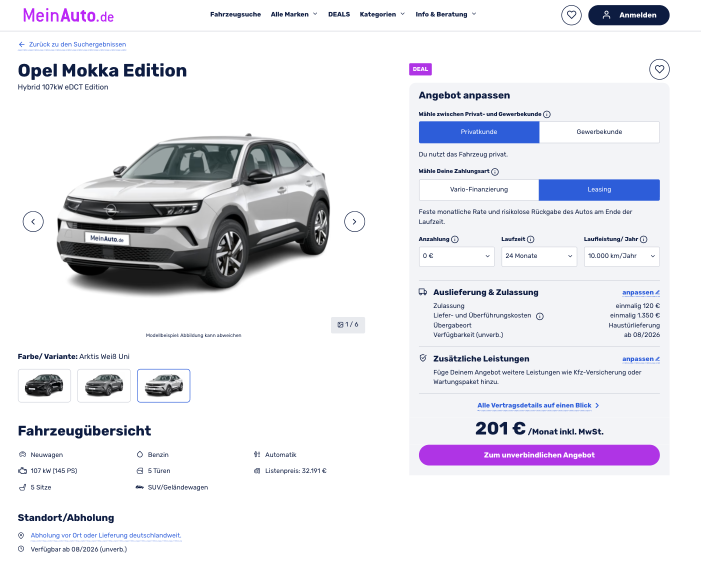 Der Opel Mokka bringt frischen Stil in die Klasse der kompakten SUV. Opel Mokka Hybrid 107 kW eDCT Edition bei MeinAuto für 201 Euro brutto im Monat kombiniert einen modernen Hybridantrieb mit einer attraktiven Ausstattung und einer für Leasingkunden angenehm kurzen Laufzeit. Das Angebot wurde mit 24 Monaten Laufzeit und 10.000 Kilometern pro Jahr kalkuliert, Anpassungen sind möglich. Dazu kommt, dass der Mokka bereits bestellt ist und mit Sonderausstattung im Wert von 2.301 Euro kommt. Verfügbar ist das Modell in Arktis Weiß Uni, Grafik Grau Uni und Karbon Schwarz Metallic.