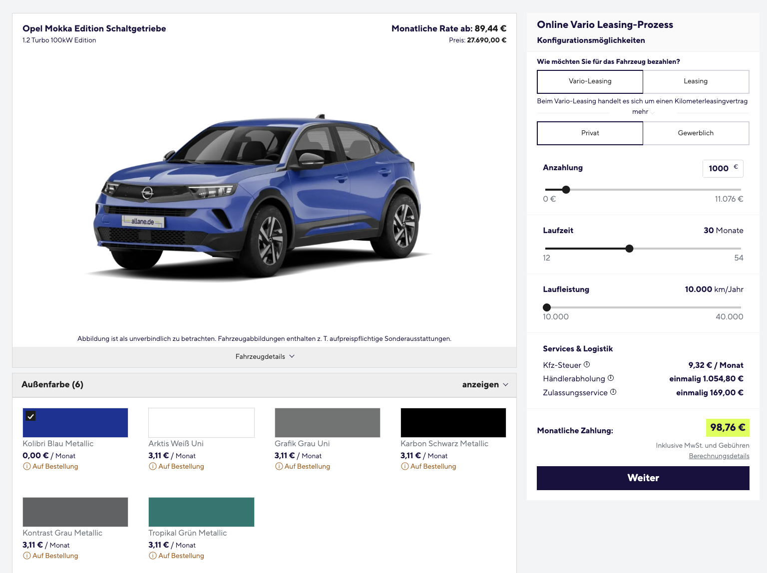 Der Opel Mokka bleibt einer der spannendsten Vertreter im Segment der kompakten SUV, besonders wenn Preis und Alltagstauglichkeit zusammenpassen. Opel Mokka 1.2 Turbo 100 kW Edition bei Allane für 98,76 Euro brutto im Monat bringt genau diese Mischung auf die Straße. Das Angebot basiert auf einem Vario-Leasing mit 1.000 Euro Anzahlung und eröffnet am Vertragsende zwei Wege. Entweder erfolgt die Übernahme für 15.783,30 Euro, oder das Fahrzeug wird nach Zahlung einer Schlussrate von 830,70 Euro zurückgegeben. Der Mokka ist bereits vorbestellt und in verschiedenen Farben wie Kolibri Blau Metallic oder Karbon Schwarz Metallic verfügbar, die Auslieferung ist in etwa drei bis vier Monaten vorgesehen.