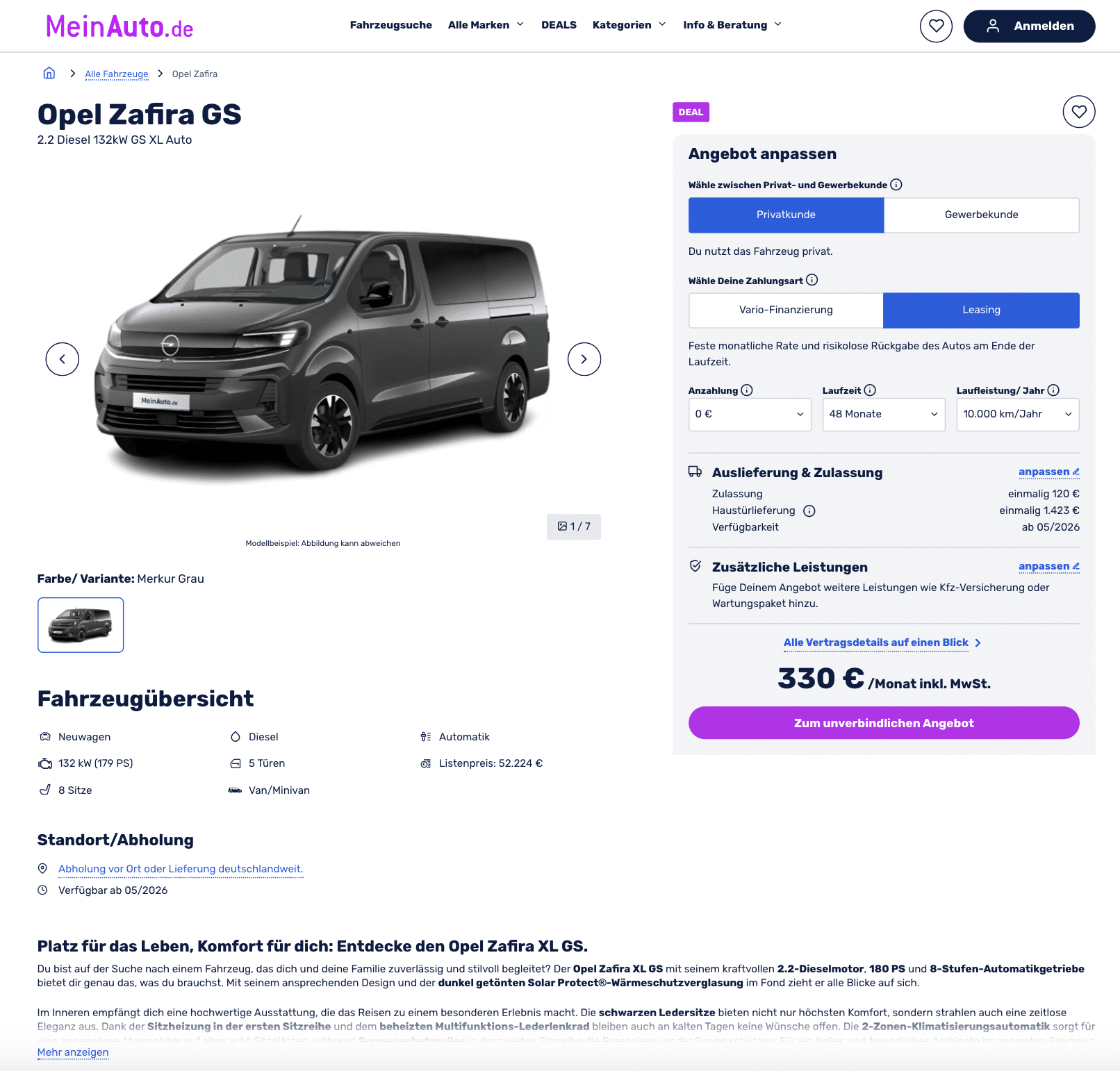 Ein Familien-Van, der den Alltag sortiert und lange Strecken gelassen nimmt. Bei MeinAuto steht der Opel Zafira 2.2 Diesel 132 kW Auto XL GS für 330 Euro brutto pro Monat im Leasing bereit. Das Fahrzeug ist vorkonfiguriert und ab Mai 2026 verfügbar, planbar, ohne Überraschungen. Acht vollwertige Sitzplätze, zwei Schiebetüren und die lange XL-Karosserie machen den Zafira zum pragmatischen Begleiter, egal ob große Crew, Business-Shuttle oder Urlaubsantritt mit kompletter Ausrüstung. Außerdem beinhalten die Überführungskosten von 1.543 Euro eine Haustürlieferung samt Zulassung.