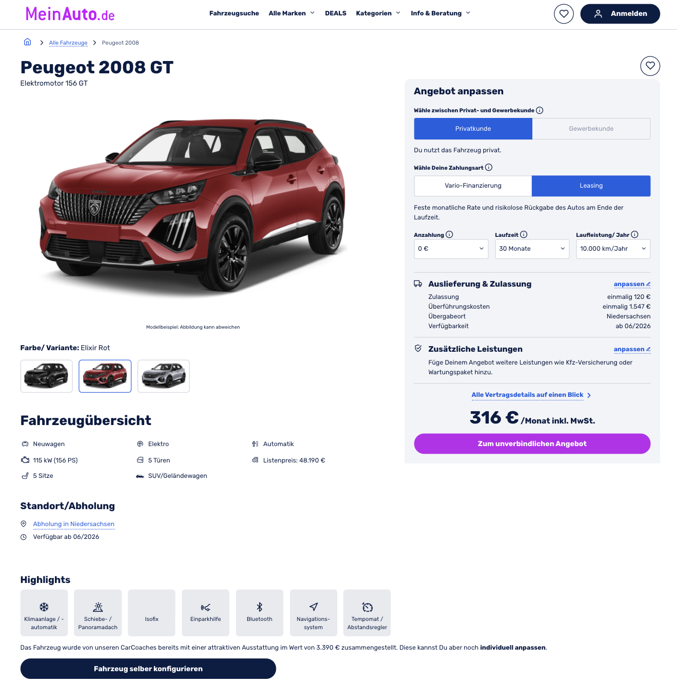 Ein Elektro-SUV, das eher mit Stil und Effizienz punktet als mit Krawall. Und weil heute der dritte Advent 🕯️ ist, passt ein leiser, smarter Stromer wie dieser perfekt ins Bild. Angeboten wird der Peugeot 2008 Elektromotor 156 GT bei MeinAuto für 316 Euro brutto im Monat, vorkonfiguriert und auf Wunsch weiter anpassbar. Das SUV ist ab Juni 2026 in den Farben Elixir Rot, Perla Nera Schwarz Metallic oder Artense Silber Metallic verfügbar.