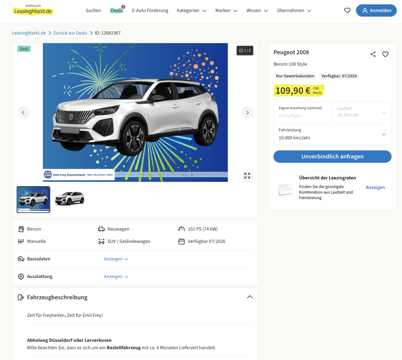 Das Angebot basiert auf 36 Monaten Laufzeit und 10.000 Kilometern pro Jahr. Besonders stark wirkt der Deal im direkten Vergleich. Während ähnliche Fahrzeuge beim Marktführer aktuell bei rund 172 Euro netto im Monat liegen, bleibt dieses Angebot mit 109,90 Euro netto deutlich darunter. Genau dieser Abstand macht den Peugeot 2008 zu einer der interessantesten Optionen im Segment der kompakten SUV im Geschäftsleasing.