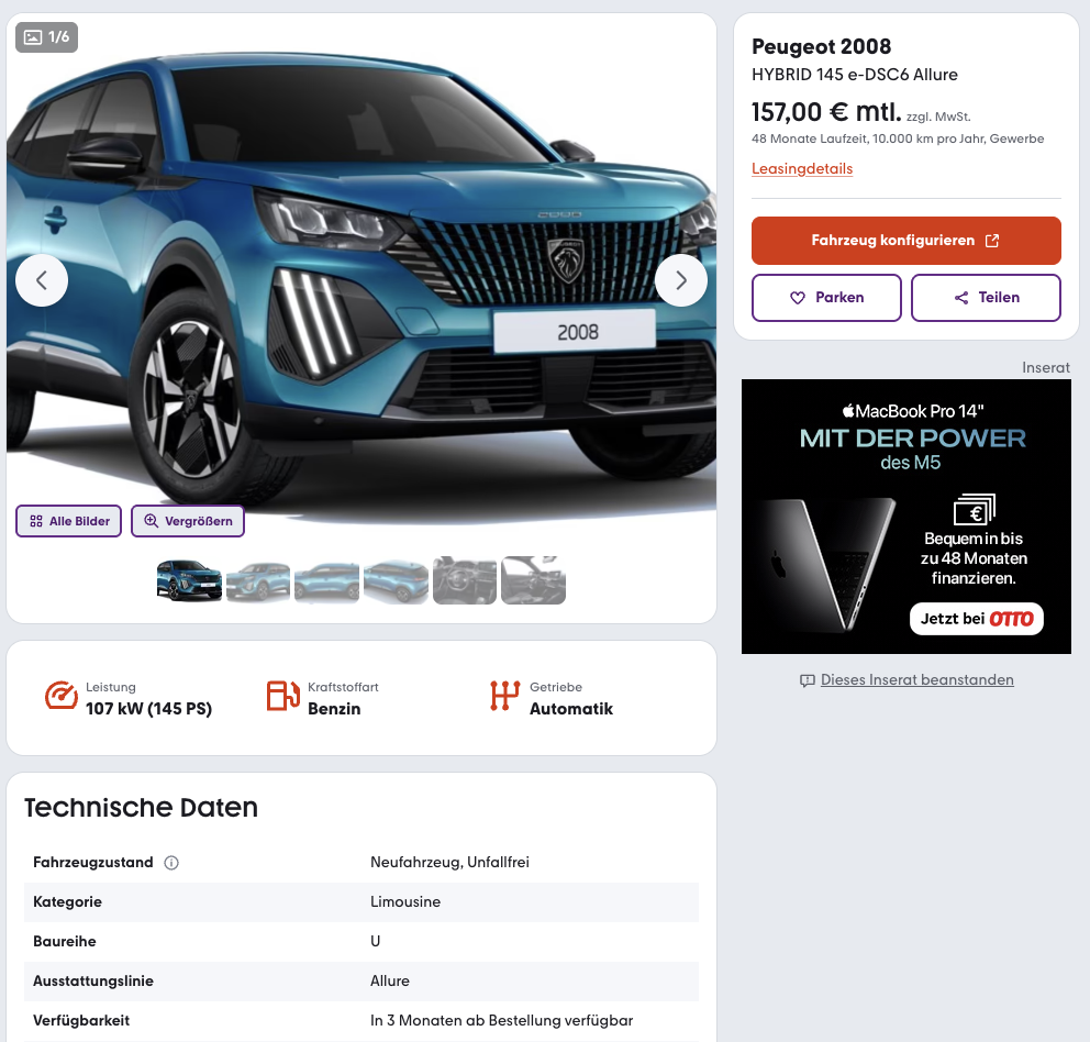 Effizient unterwegs sein, ohne auf Komfort zu verzichten? Genau das bietet der Peugeot 2008 Hybrid 145 e-DSC6 Allure, den Geschäftskunden bei mobile.de für 157 Euro netto im Monat leasen können.. Das Angebot bezieht sich auf ein frei konfigurierbares Bestellfahrzeug, wodurch Ausstattung und Lackierung individuell gewählt werden können. Besonders angenehm, die Lieferzeit liegt bei rund drei Monaten und bleibt damit überschaubar.