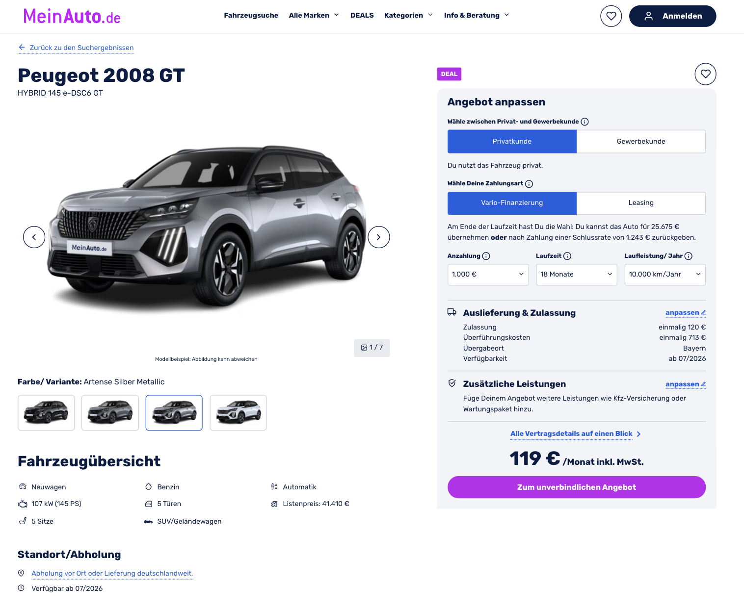 Nach 12 Monaten Laufzeit entscheidet sich, wie es weitergeht. Der 2008 kann fĂĽr 25.675 Euro ĂĽbernommen oder gegen eine Schlussrate von 1.243 Euro zurĂĽckgegeben werden. Das Fahrzeug ist bereits bestellt und wird voraussichtlich im Juli 2026 ausgeliefert. Zur Wahl stehen mehrere Metallic-Farben, darunter Perla Nera Schwarz, Selenium Grau, Artense Silber und Okenit WeiĂź.