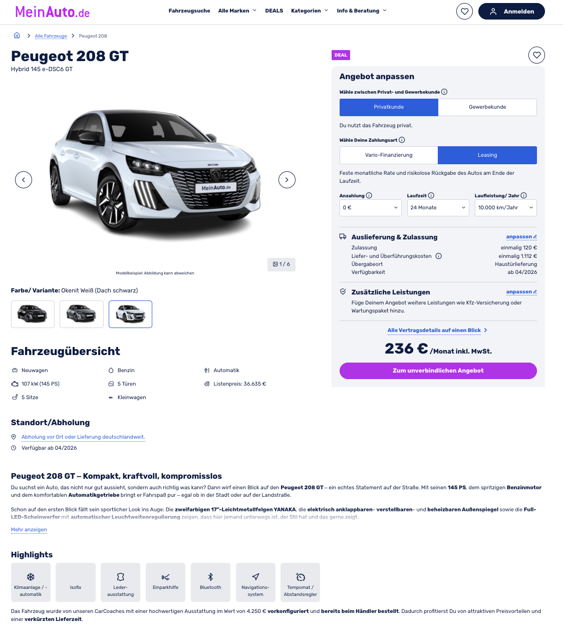 Ein kompakter Hybrid, der in der Stadt flink bleibt und im Verbrauch sehr sparsam ist. MeinAuto bietet den Peugeot 208 Hybrid 145 e DSC6 GT fĂŒr 236 Euro brutto im Monat, kalkuliert auf 24 Monate und 10.000 Kilometer pro Jahr, vorkonfiguriert und mit geplanter VerfĂŒgbarkeit ab April 2026. Farblich gibt es genau die richtigen Optionen fĂŒr den Winterlook, Okenit WeiĂ, Selenium Grau Metallic mit Black Diamond Kontrastdach oder Perla Nera Schwarz Metallic, je nach Geschmack von clean bis elegant dunkel.