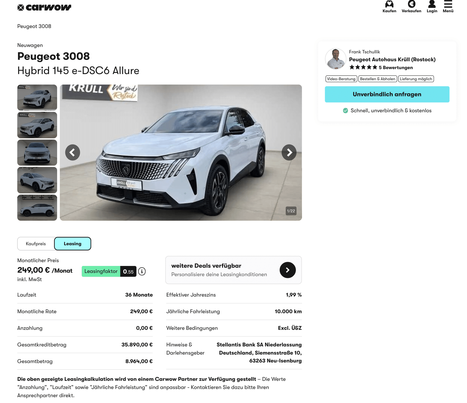 Kalkuliert ist das Angebot mit 36 Monaten Laufzeit und 10.000 km/Jahr, beides lässt sich bei Bedarf anpassen. Der Vergleich macht den Vorteil greifbar: Der Marktführer ruft für den 3008 derzeit 505 Euro brutto pro Monat auf, damit liegt der Lagerwagen-Deal ab 249 Euro deutlich darunter. Wer ein SUV mit elegantem Auftritt, viel Nutzwert und moderner Hybrid-Effizienz sucht, bekommt hier eine selten klare Rechnung: kurze Verfügbarkeit, faire Rate, komplettes Alltags-Paket.