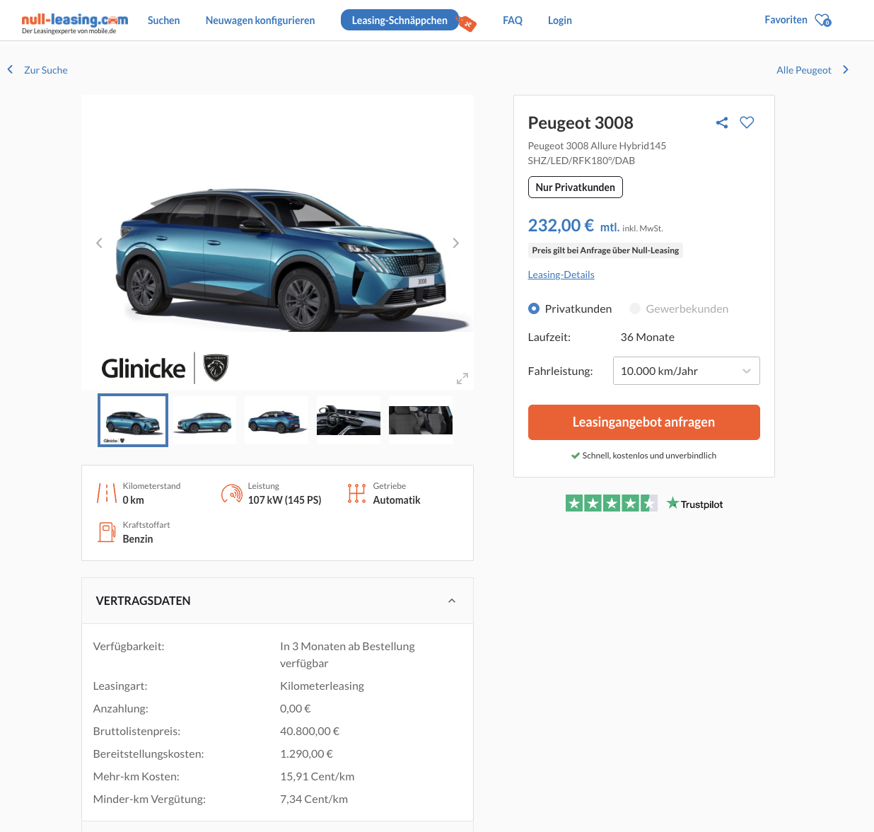 Spannend wird es im Vergleich. Der Marktführer listet den Peugeot 3008 aktuell mit rund 505 Euro brutto pro Monat.