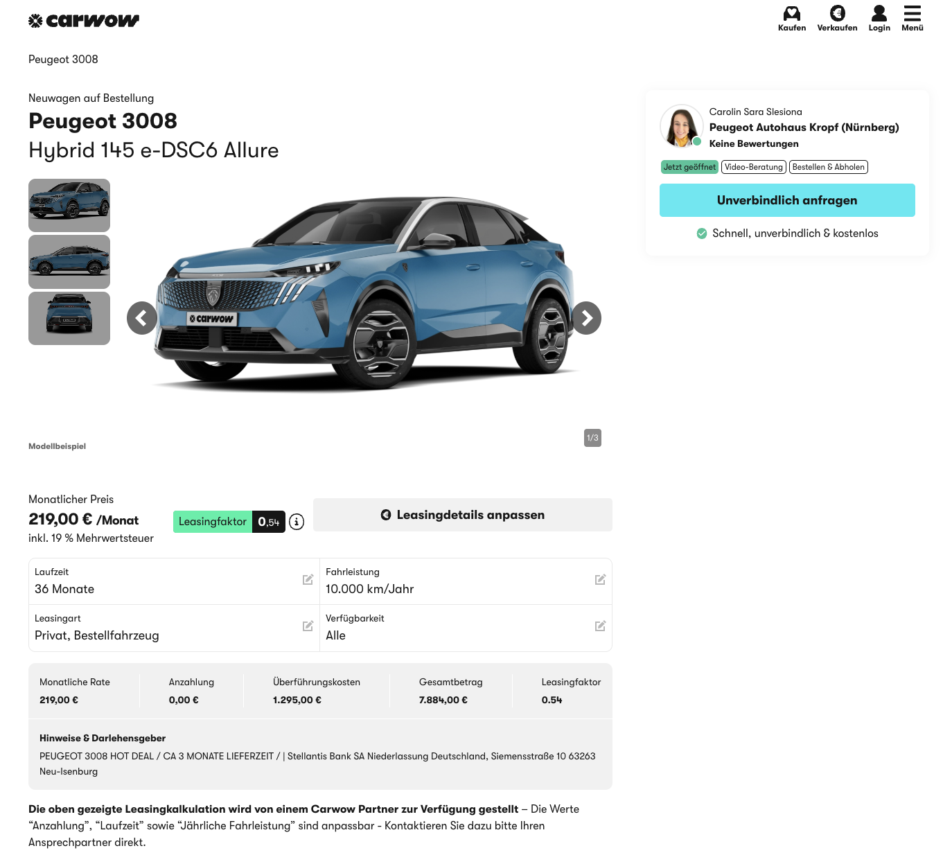 Heiligabend Deal 🎄 mit Stil und Effizienz. Aktuell gibt es den Peugeot 3008 Hybrid 145 e-DSC6 Allure bei carwow für 219 Euro brutto im Monat, im Privatleasing als Bestellaktion, komplett nach euren Wünschen konfigurierbar, mit rund drei Monaten Lieferzeit.
