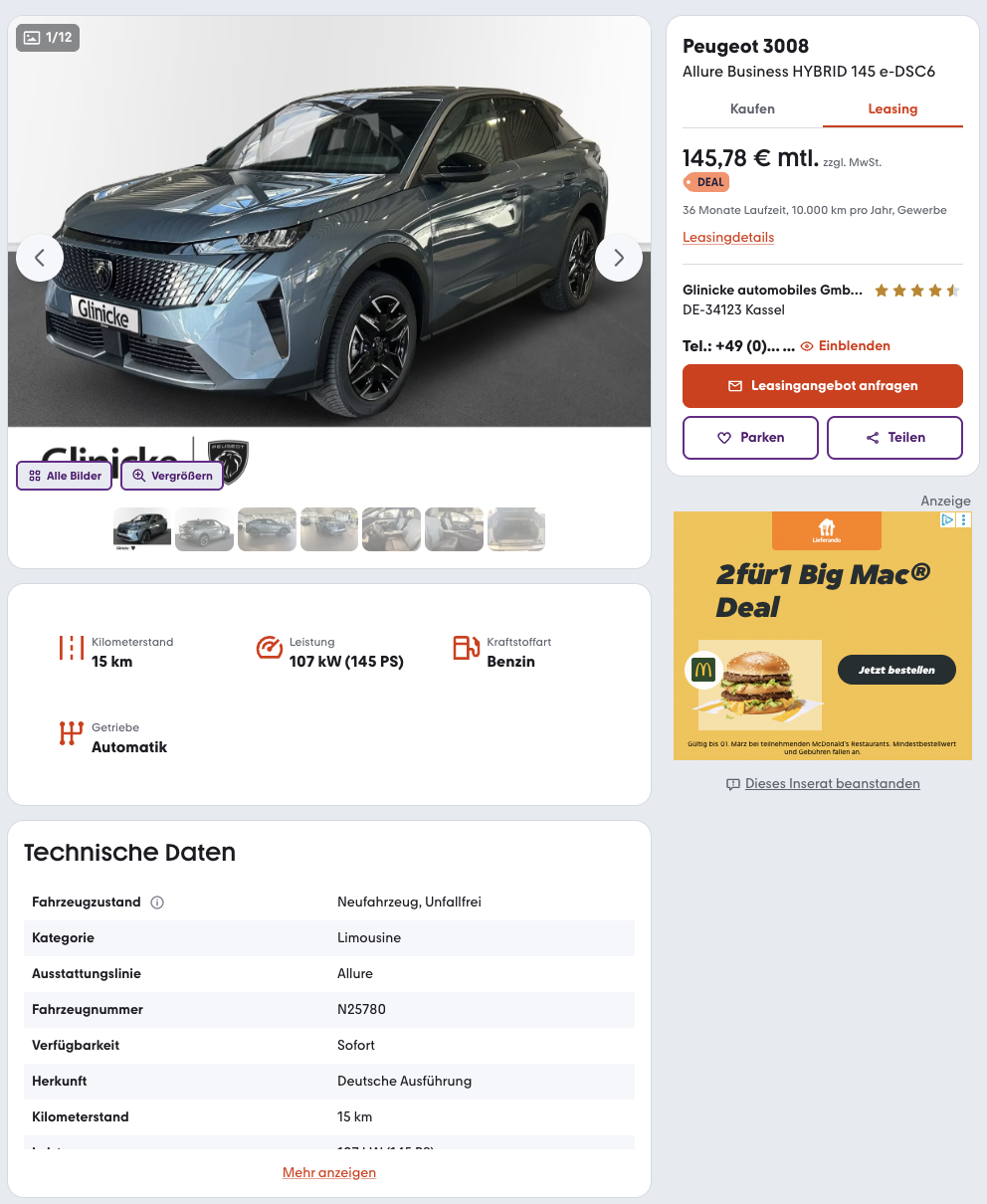 Die Kalkulation basiert auf 36 Monaten Laufzeit und 10.000 Kilometern pro Jahr, Anpassungen sind in der Regel möglich. Im Vergleich zeigt sich der Vorteil: Der Platzhirsch listet den Peugeot 3008 laut Angabe aktuell bei rund 189 Euro netto pro Monat, hier startet ihr bei 145,78 Euro netto.