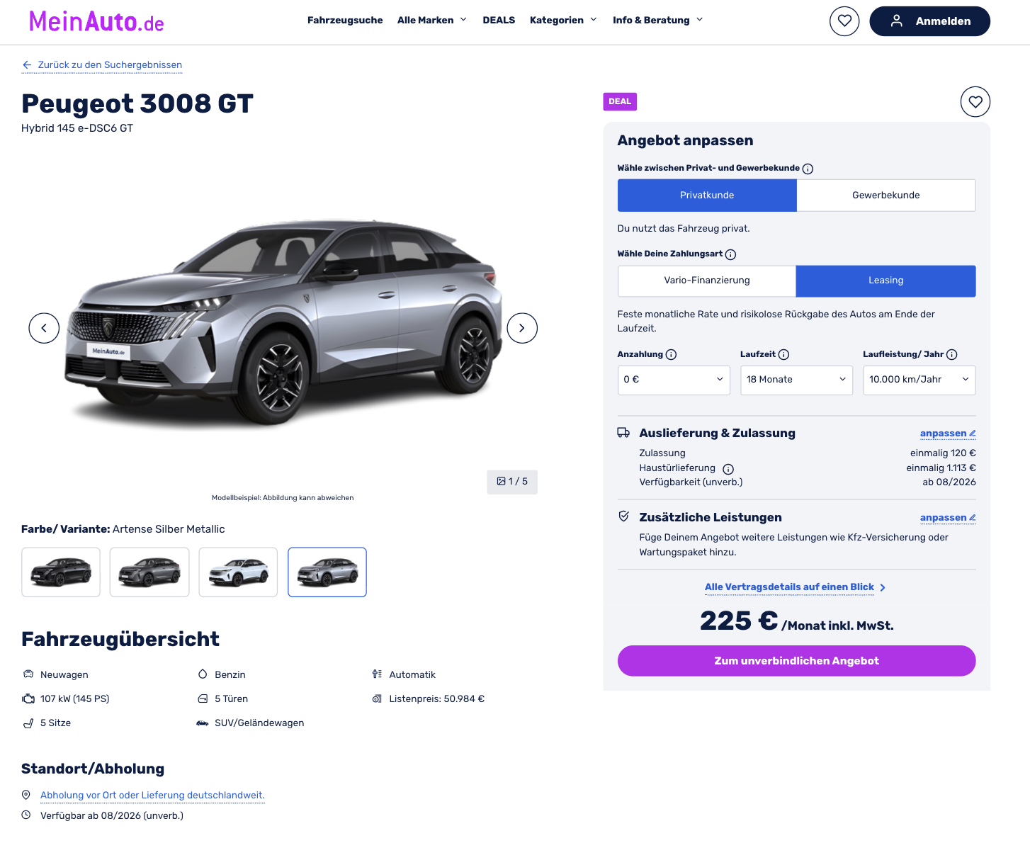 Die Konditionen sind klar strukturiert und auf kurze Laufzeit ausgelegt. Besonders deutlich wird die Attraktivität im Vergleich. Während ein ähnlich ausgestatteter Peugeot 3008 beim Marktführer aktuell bei rund 934 Euro brutto im Monat liegt, kostet dieses Angebot nur 225 Euro.