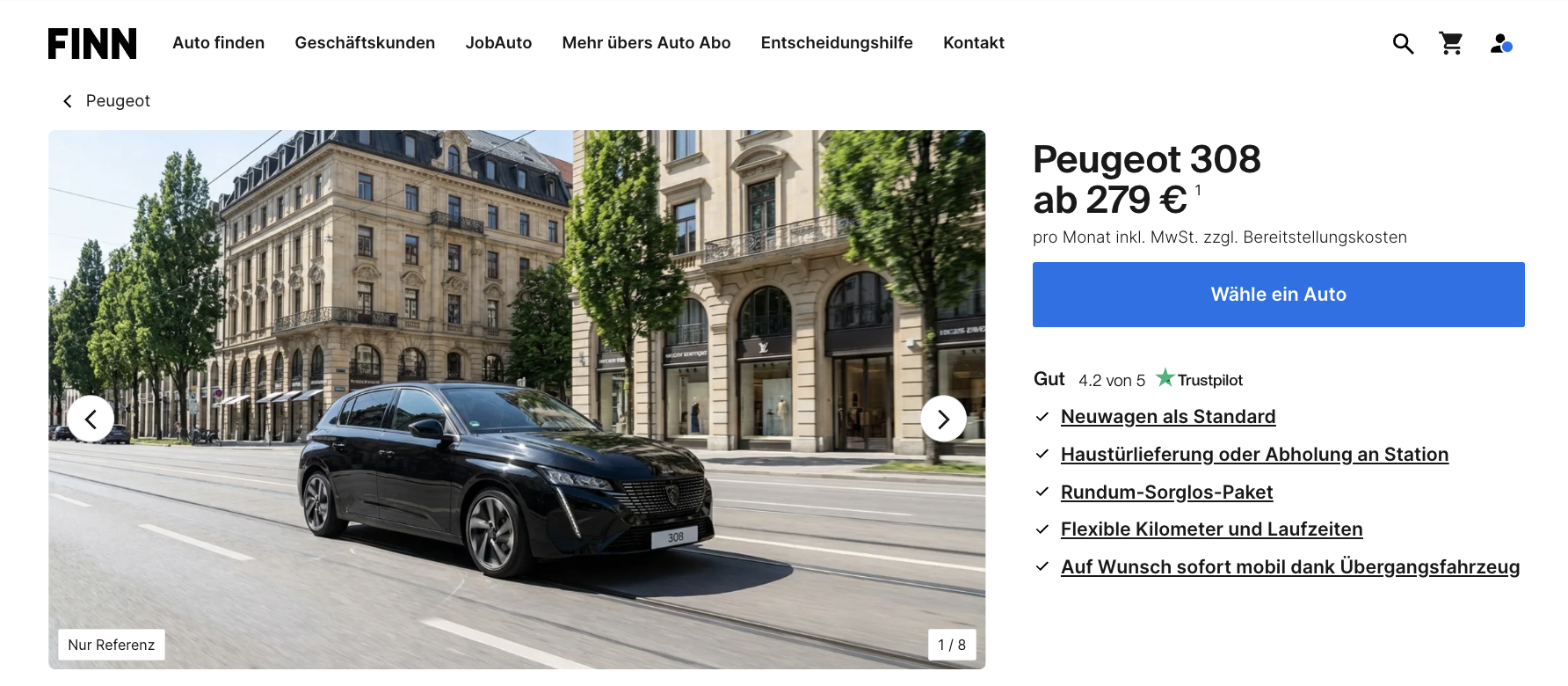 Der Peugeot 308 gehört zu den Modellen, die Effizienz und Komfort in der Kompaktklasse sauber verbinden. Peugeot 308 Diesel 130 E8 Allure bei FINN für 279 Euro brutto im Monat bringt genau dieses Konzept in ein Auto-Abo, das bewusst auf Flexibilität setzt. Statt langfristiger Leasingverträge steht hier ein Modell im Fokus, das sich an wechselnde Bedürfnisse anpasst. Die Verfügbarkeit ist aktuell ab Mitte Mai 2026 geplant. Alternativ steht für 299 Euro brutto monatlich auch der Peugeot 308 Hybrid 145 GT zur Wahl.