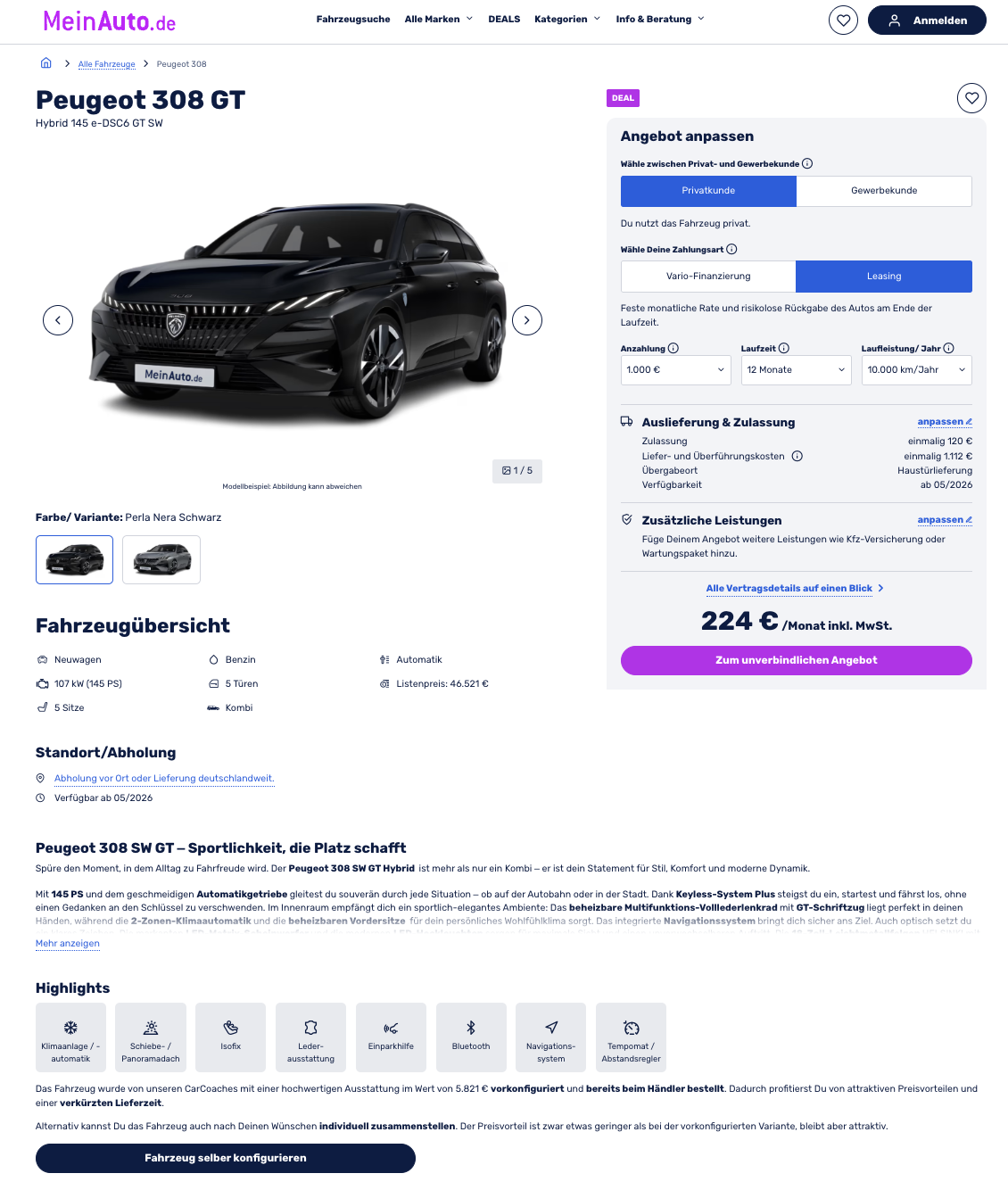 Das Leasing läuft über 12 Monate mit 10.000 Kilometern pro Jahr, Anpassungen sind möglich. Besonders auffällig wird der Deal im Vergleich, denn beim Marktführer kostet ein Peugeot 308 SW Hybrid 145 e-DSC6 GT mit identischer Ausstattung und gleicher Anzahlung laut Angabe 1.110 Euro brutto im Monat. Damit bewegt sich dieses Angebot in einer völlig anderen Liga und macht den 308 SW zu einem der aktuell spannendsten Hybrid-Kombis im Leasing.