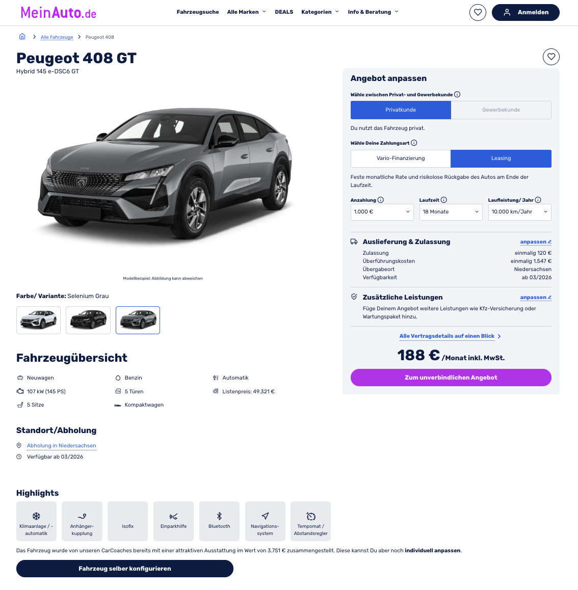 Ein Fastback, der sich nicht zwischen SUV und Limousine entscheiden will und genau dadurch auffĂ€llt. Gemeint ist der Peugeot 408 Hybrid 145 e-DSC6 GT, den ihr aktuell bei MeinAutofĂŒr 188 Euro im Monat brutto leasen könnt. Kalkuliert wurde das Angebot mit 1.000 Euro Anzahlung, als Vorlauffahrzeug mit Sonderausstattung im Wert von 3.751 Euro, und farblich wĂ€hlbar in Selenium Grau, Perla Nera Schwarz oder Okenit WeiĂ. Die Auslieferung ist fĂŒr MĂ€rz 2026 geplant. Ohne Anzahlung betrĂ€gt die Leasingrate 244 Euro brutto pro Monat.