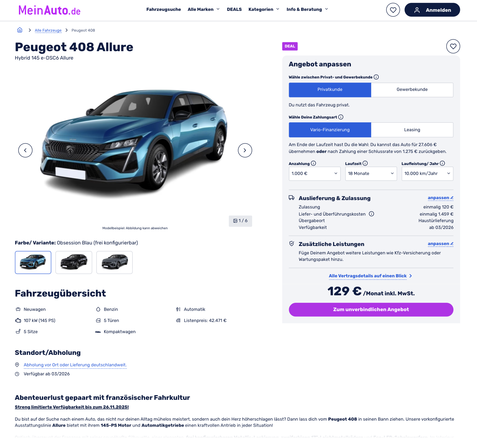Ein Crossover fĂŒr alle, die zwischen Limousine und SUV nichts Passendes finden. Den Peugeot 408 Hybrid 145 e DSC6 Allure gibt es bei MeinAuto im Vario-Leasing fĂŒr nur 129 Euro brutto im Monat, bei 1.000 Euro Anzahlung. Die Laufzeit liegt bei 18 Monaten mit 10.000 Kilometern pro Jahr, danach entscheidet ihr selbst, wie es weitergeht. Ihr könnt den 408 fĂŒr 27.606 Euro ĂŒbernehmen oder nach Zahlung einer Schlussrate von 1.275 Euro zurĂŒckgeben. Wer lieber klassisch least, landet beim gleichen Auto bei 194 Euro brutto im Monat, ebenfalls mit 1.000 Euro Anzahlung. Es handelt sich um ein frei konfigurierbares Bestellfahrzeug, das ihr individuell zusammenstellen könnt, von Lack ĂŒber Felgen bis hin zu den Ausstattungspaketen. Die Auslieferung ist fĂŒr MĂ€rz 2026 geplant.