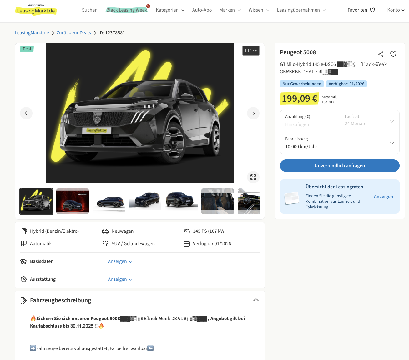 Sieben Sitze, Hybrid-Effizienz und ein souveräner Auftritt in XXL. Den Peugeot 5008 Hybrid 145 e-DSC6 GT können Geschäftskunden bei LeasingMarkt für 167,30 Euro netto pro Monat leasen, ein vollausgestattetes Fahrzeug, bei der ihr die Farbe frei wählen könnt. Das Angebot hat einen ausgezeichneten Leasingfaktor von 0.37. Zulassungspflicht im November 2025