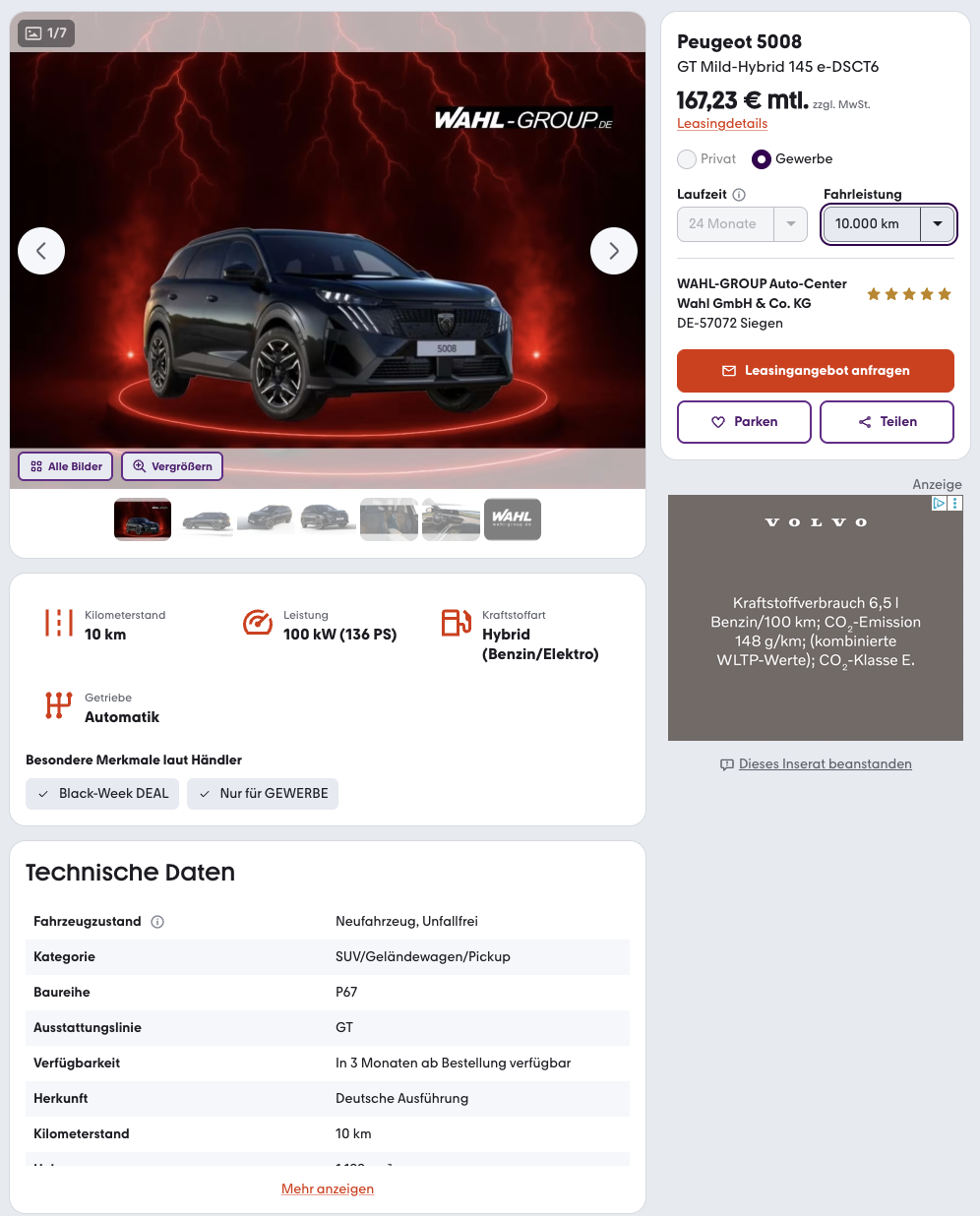 Ob für Großfamilie, das Business, oder im Alltag, dieser SUV deckt alles ab und bleibt dabei entspannt. Den Peugeot 5008 Hybrid 145 e-DSC6 GT gibt es bei mobile.de für nur 167,30 Euro netto im Geschäftsleasing. Verfügbarkeit in etwa 3 Monaten ab Bestellung, berechnet mit einer Laufzeit von 24 Monaten und 10.000 Freikilometer. Wer viel Raum, moderne Hybridtechnik und einen gelassenen Auftritt sucht, bekommt hier ein Paket mit überzeugendem Gegenwert und klaren Zahlen.