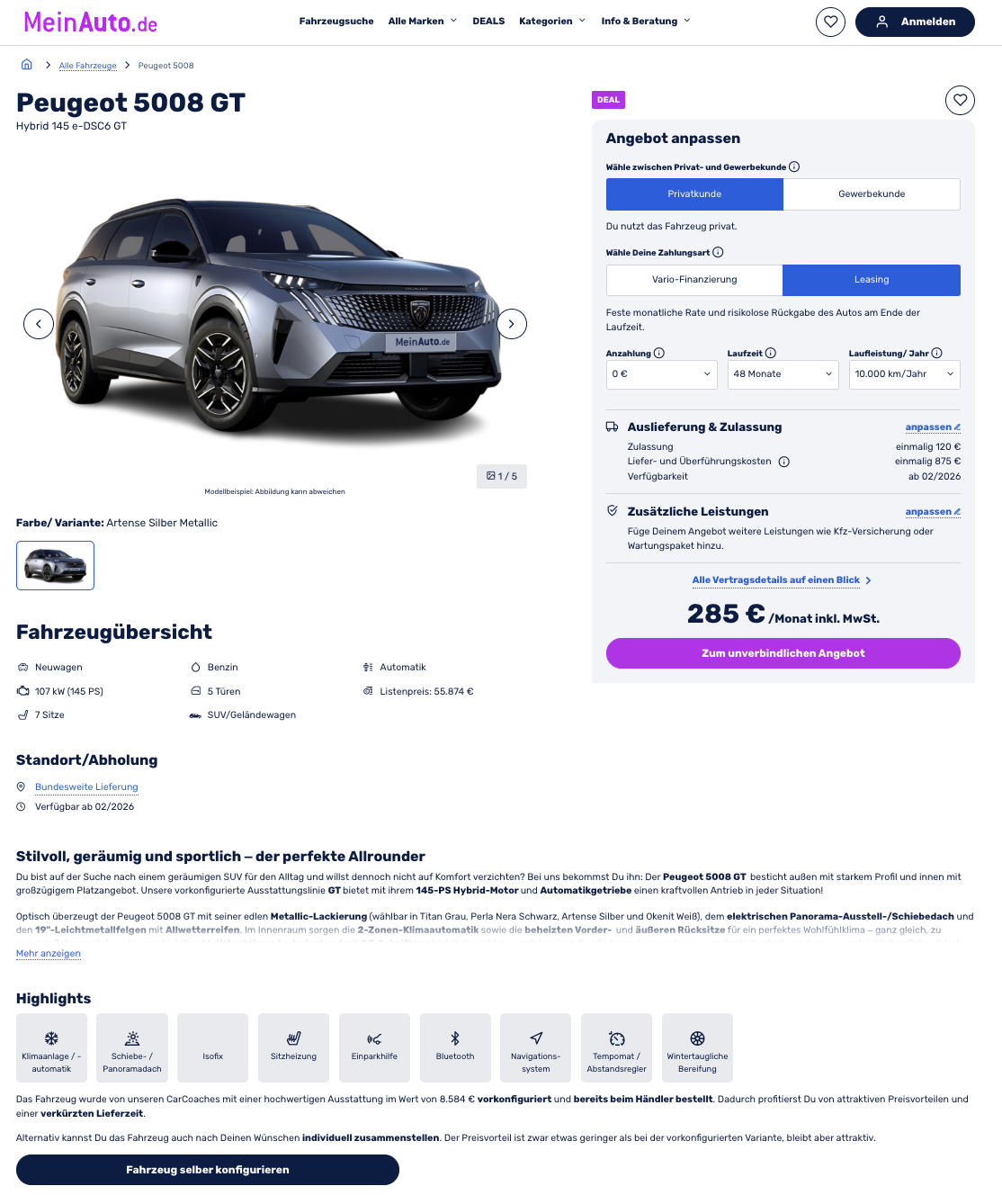 Kalkuliert ist das Angebot mit 48 Monaten Laufzeit und 10.000 Kilometern pro Jahr, beides lässt sich anpassen. Der Preisvergleich fällt deutlich aus, denn der Platzhirsch ruft für ein ähnlich ausgestattetes Fahrzeug 606 Euro brutto im Monat auf. Hier steht der 5008 GT spürbar näher an der Vernunft, trotz sieben Sitzen und voller Technikladung.