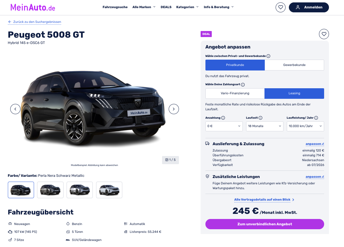 Die Konditionen sind klar strukturiert: 18 Monate Laufzeit und 10.000 Kilometer pro Jahr, beide Werte lassen sich in vielen Fällen anpassen. Mit 245 Euro brutto monatlich bleibt die Rate für ein großes SUV dieser Klasse bemerkenswert niedrig. Der direkte Marktvergleich zeigt den Unterschied besonders deutlich. Während große Anbieter für einen vergleichbaren Peugeot 5008 teilweise über 1.000 Euro brutto pro Monat verlangen, bleibt dieses Angebot klar darunter.