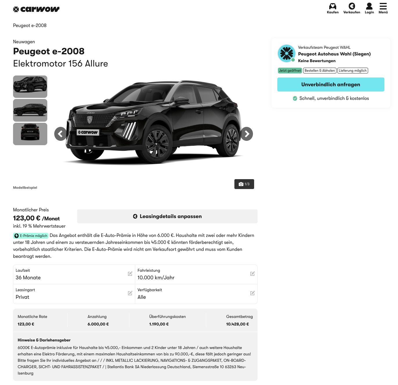Der Peugeot e-2008 gehört zu den kompakten Elektro-SUV, die Alltagstauglichkeit und moderne Technik ohne groĂes Aufheben verbinden. Peugeot e-2008 156 Allure bei carwow fĂŒr 123 Euro brutto im Monat ist aktuell ein auffĂ€llig niedrig kalkuliertes Privatleasing. Das Angebot wurde mit einer Sonderzahlung von 6.000 Euro brutto in Form der UmweltprĂ€mie berechnet. Das Fahrzeug ist bereits bestellt und wird mit einer Lieferzeit von zwei bis drei Monaten angegeben. ZusĂ€tzlich sind bereits Metallic-Lackierung, Navigations- und Zugangspaket, On-Board-Charger sowie das Sicht- und Fahrassistenzpaket enthalten.
