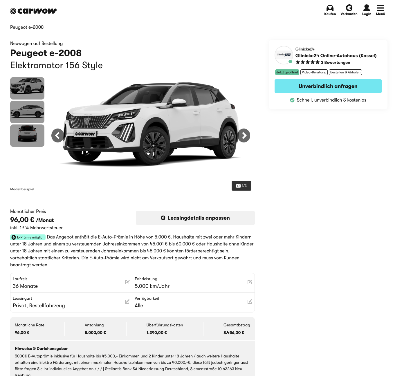 Peugeot e-2008 dank UmweltprĂ€mie fĂŒr nur 96 Euro im Monat brutto bei carwow leasen. Das Angebot mit dem Peugeot e-2008 156 Style ist eine Bestellaktion, wodurch sich Farbe, Ausstattung und weitere Details noch an die eigenen WĂŒnsche anpassen lassen. Kalkuliert wurde der Deal mit einer Sonderzahlung von 5.000 Euro, die als UmweltprĂ€mie angesetzt ist. Die Lieferzeit betrĂ€gt rund vier Monate.