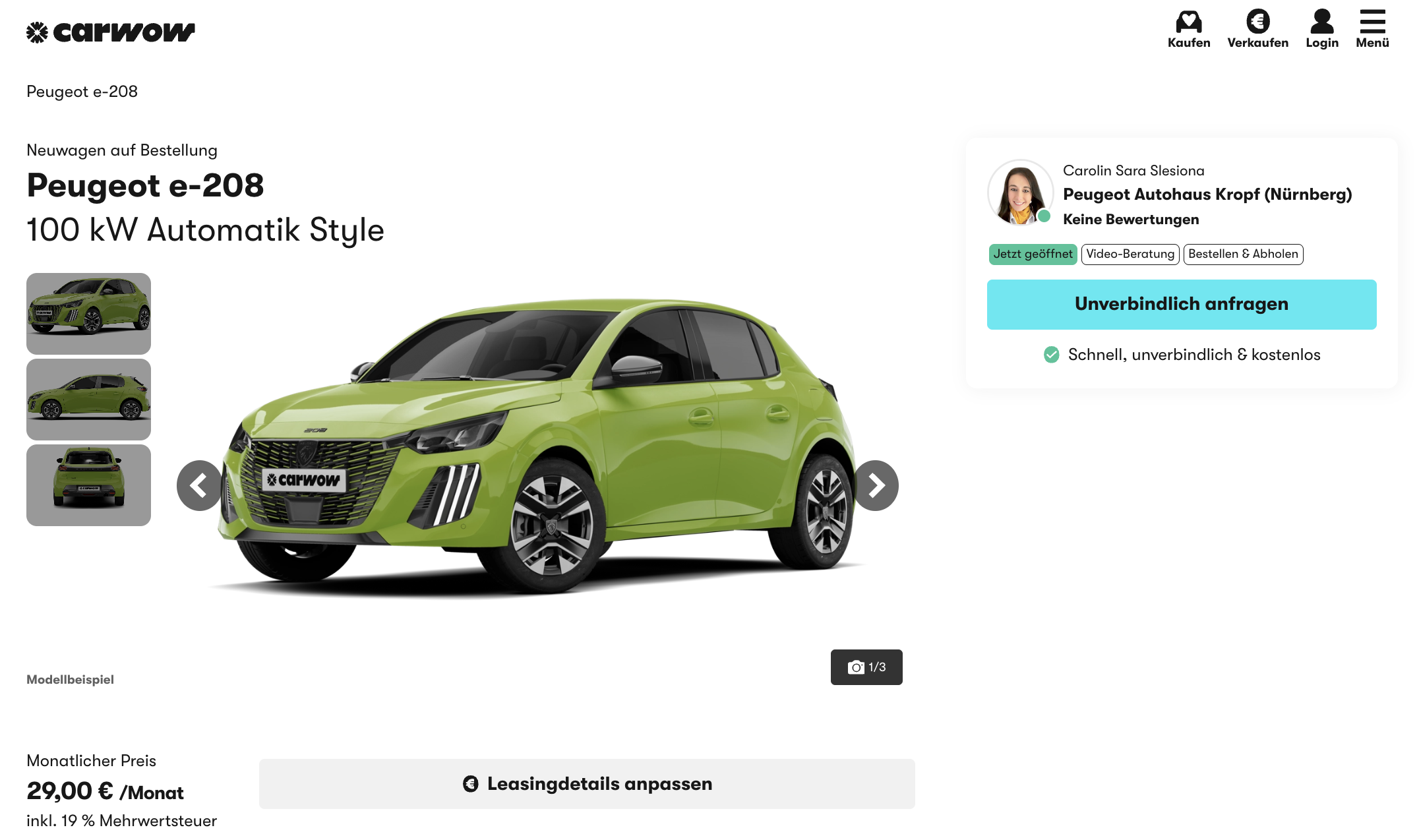 So billig wie bei diesem Peugeot war Elektro noch nie. Der Peugeot e-208 136 Style bei carwow für nur 29 Euro brutto im Monat ist ein Deal, der vor allem für Privatkunden aktuell schwer zu toppen ist. Möglich wird diese extrem niedrige Rate durch eine erstattungsfähige Anzahlung von 6.000 Euro, die im Rahmen der neuen Umweltprämie angesetzt wird. Die Lieferzeit beträgt etwa drei Monate. Bei voller Erstattung beträgt der Leasingfaktor marginale 0,08!